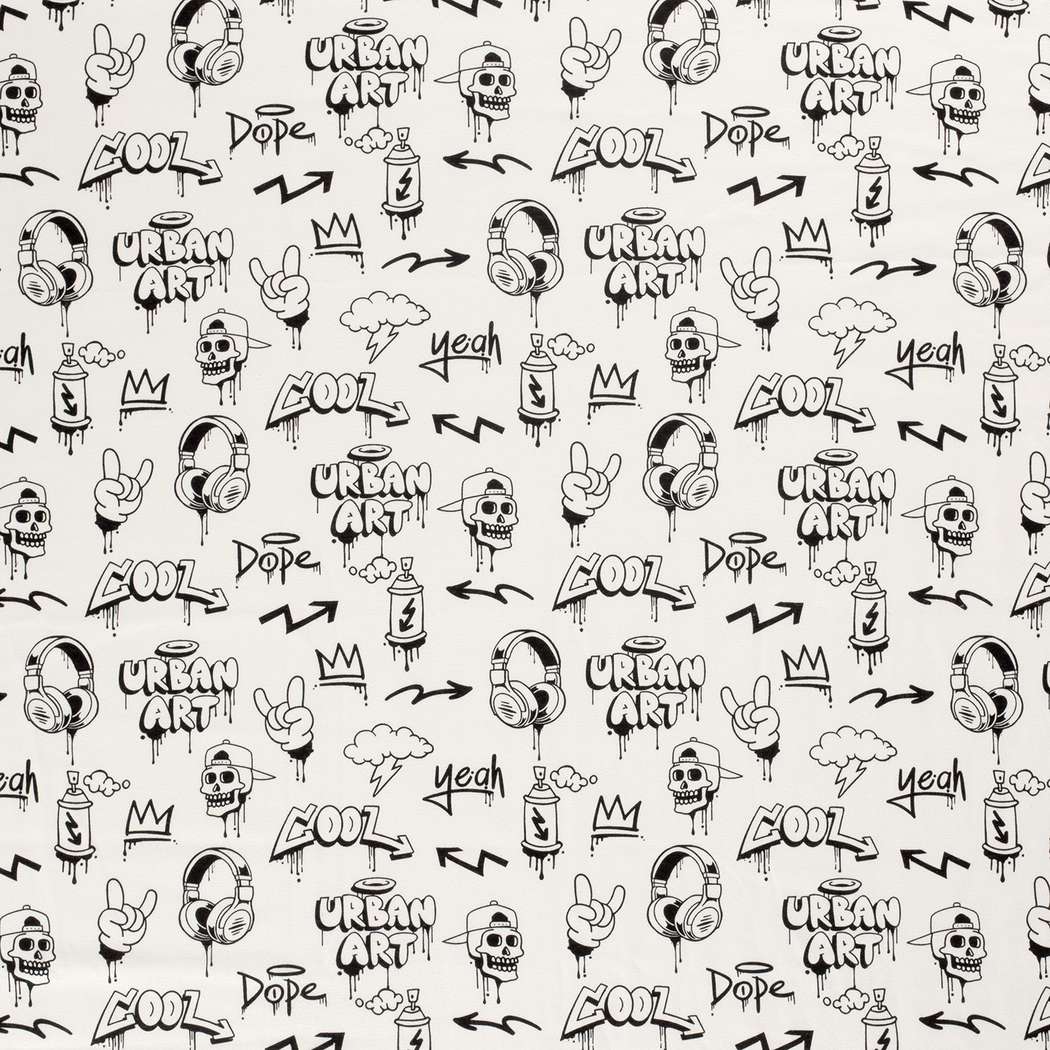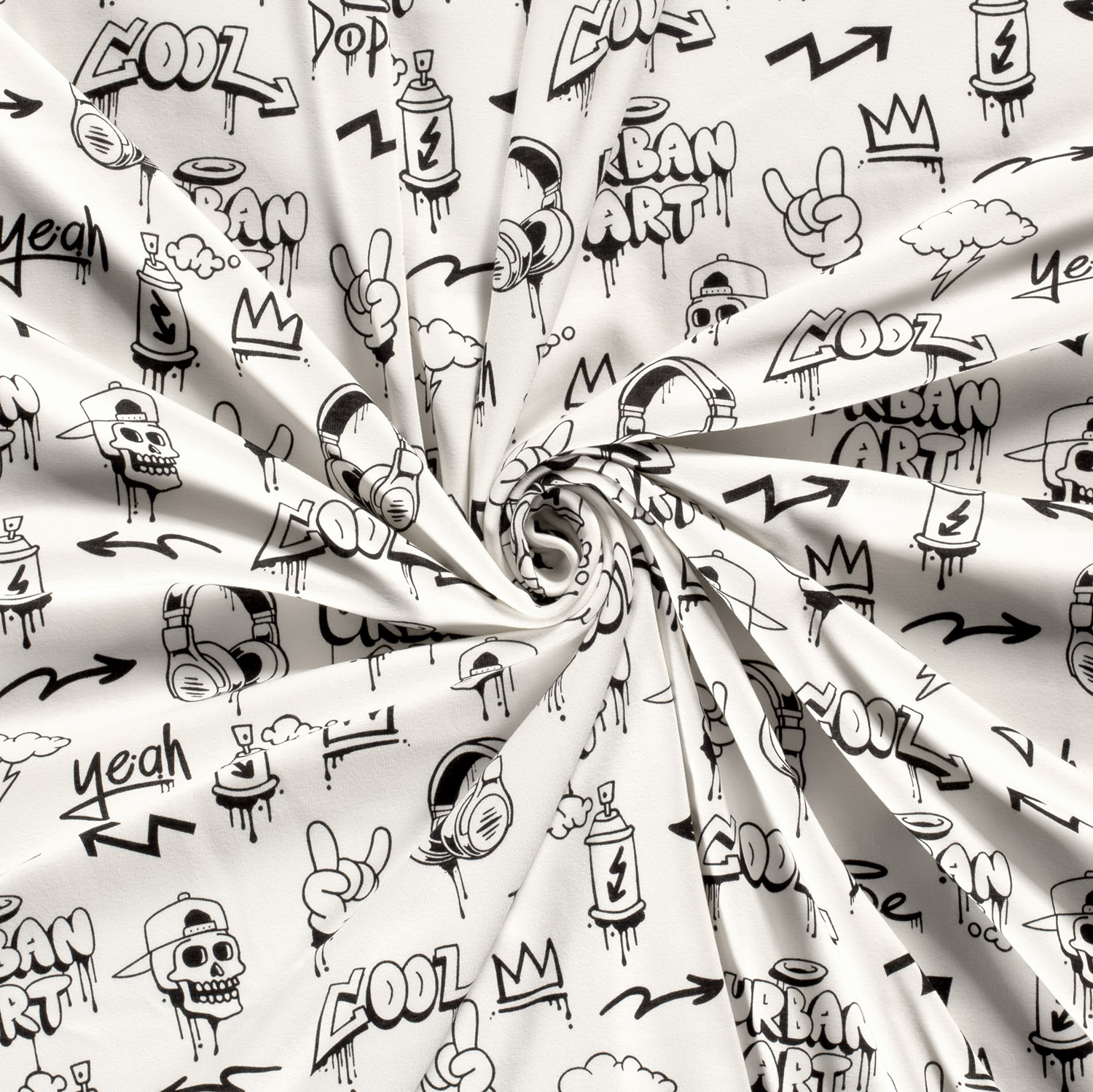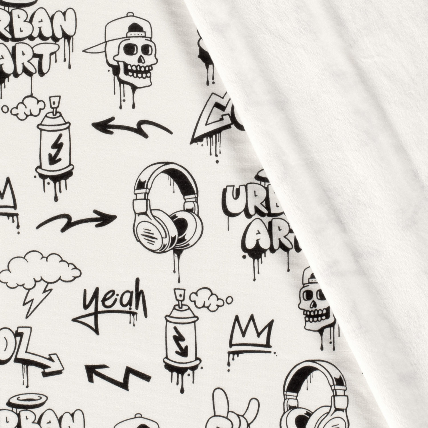 Urban, tuff och supermysig – denna alpenfleece tar streetstyle direkt in i dina sömnadsprojekt. På den vita bakgrunden leker färgglada graffiti-element som små tags, pilar, stjärnor och klotter i starka färger. Lysande blått, fräscht gult, starkt rött, mjuka pastelltoner och mörka accenter skapar en levande och dynamisk look som direkt fångar ögat.