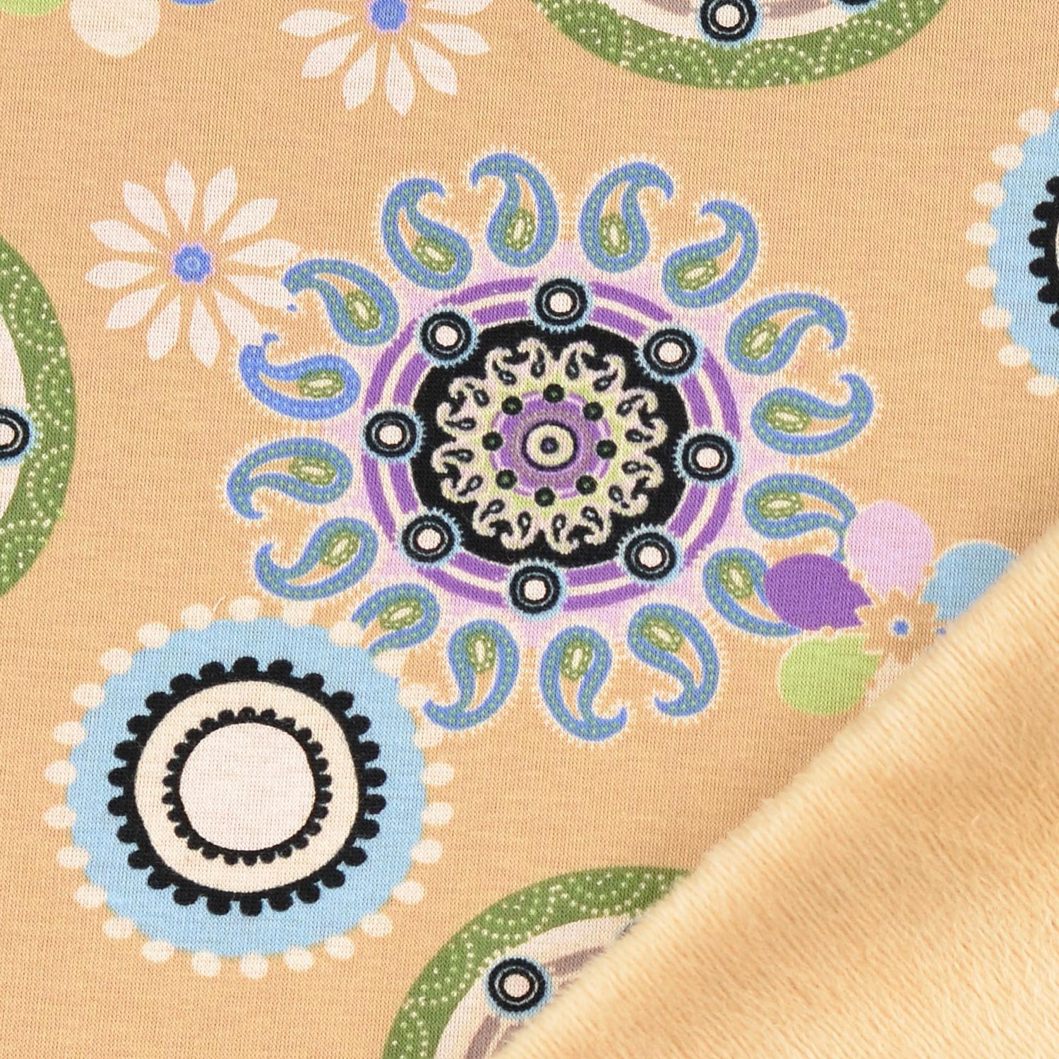 Den mjuka, gosiga insidan inbjuder direkt till att krypa in och gör detta tyg perfekt för mysiga hoodies, sköna tröjor, jackor, filtar, halsdukar eller hemmakläder. Den diskreta, men ändå uttrycksfulla blommande mandaladesignen passar utmärkt till enfärgade basplagg och kan kombineras på många sätt – för stora som små.