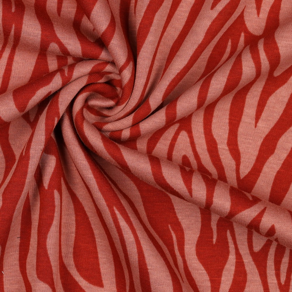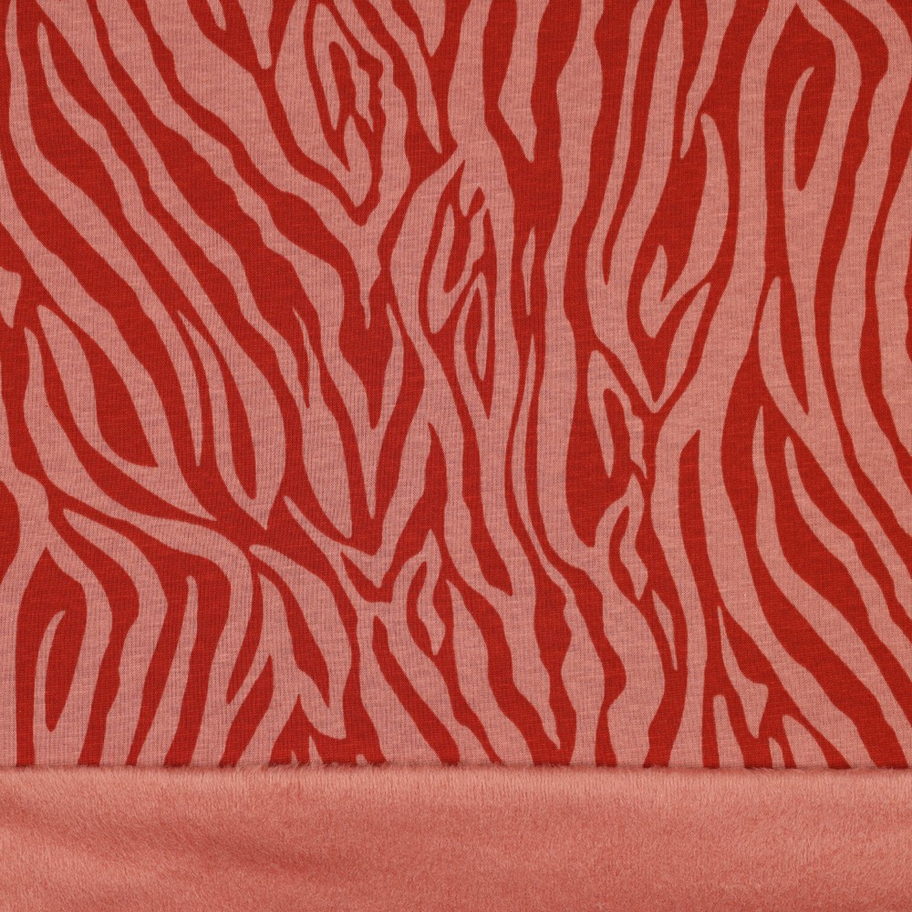 Ett tyg gjort för att krypa in i: Denna alpenfleece kombinerar ett modernt djurprint med en underbart varm och mjuk insida. På utsidan drar ett levande zebramönster all uppmärksamhet – de dynamiska, mörka ränderna står tydligt ut mot den korallfärgade bakgrunden och ger designen en trendig och lekfull känsla.