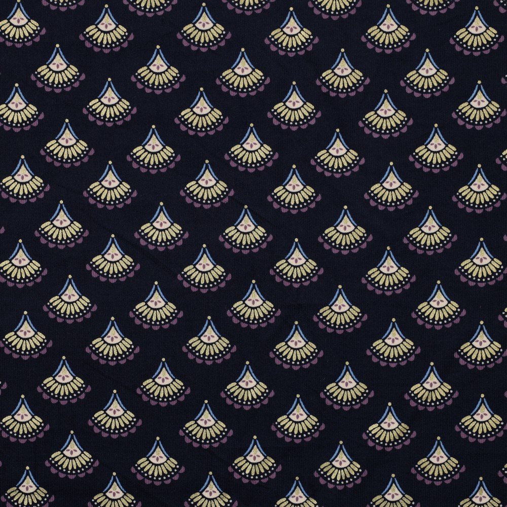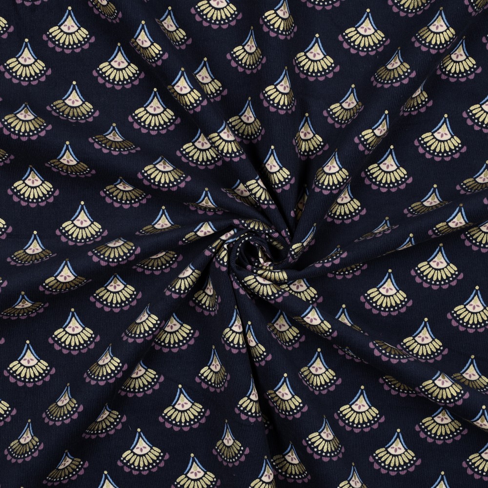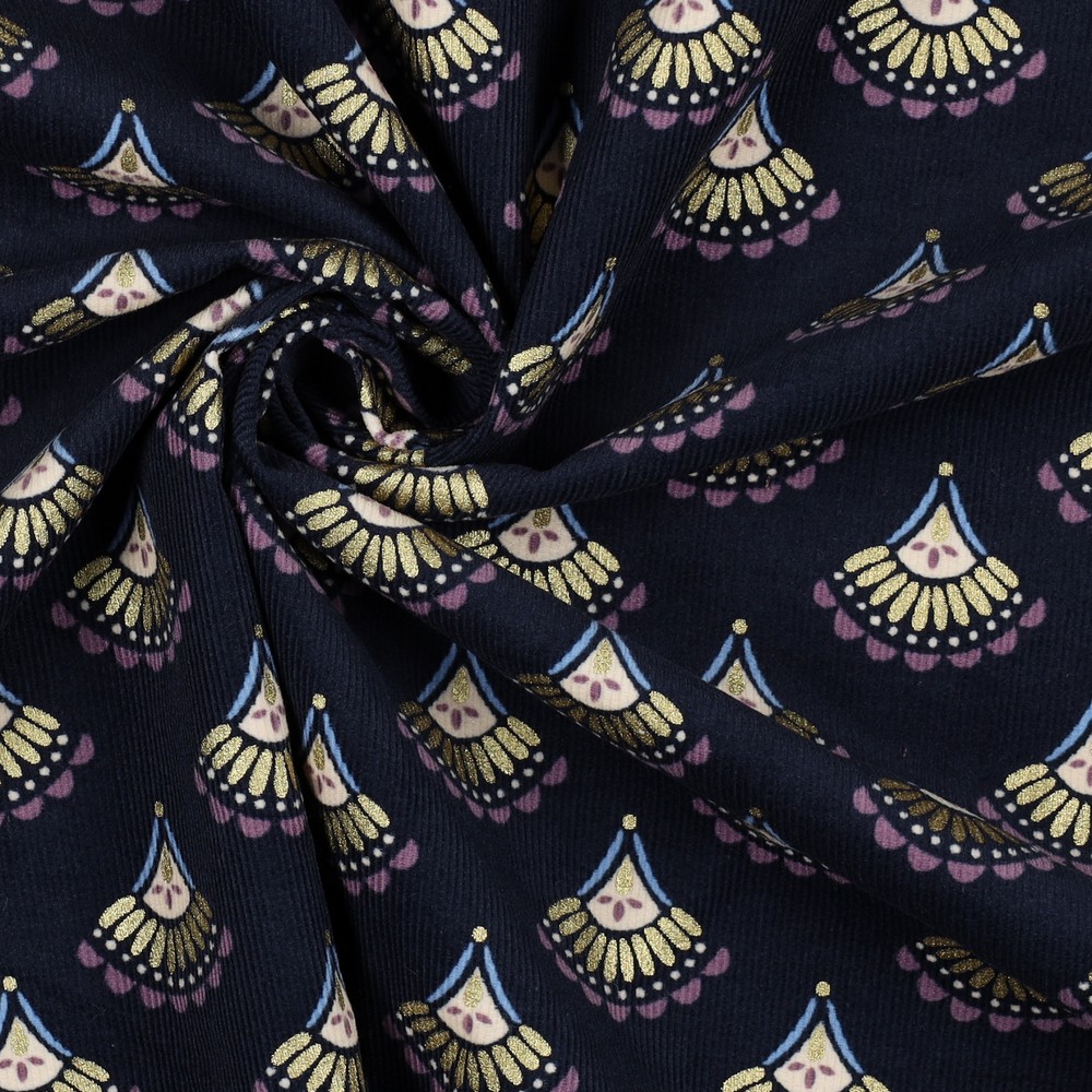 Ett tyg som är som gjort för små och stora favoriter: Denna babymanchester förtrollar med sitt eleganta boho-fläktmönster i varmt guld på djup marinblå botten. Den fina ribbade strukturen ger designen en sofistikerad touch, medan det mjuka skimret från de gyllene fläktarna ger en touch av elegans.