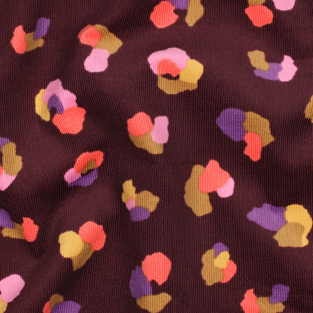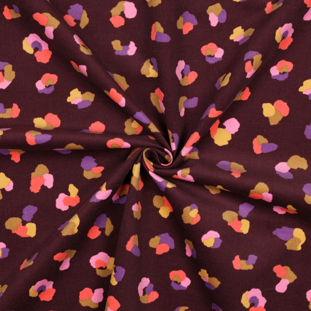 Vild, lekfull och ändå härligt mysig – denna babycord med färgglatt leo-tryck i Bordeaux är ett riktigt blickfång för små och stora modefans. På den mjuka kordgrund i djupt Bordeaux leker stiliga leopardfläckar i glada färger som rosa, orange, curry, blått och turkos – ett modernt djurprint med garanterad glad känsla.