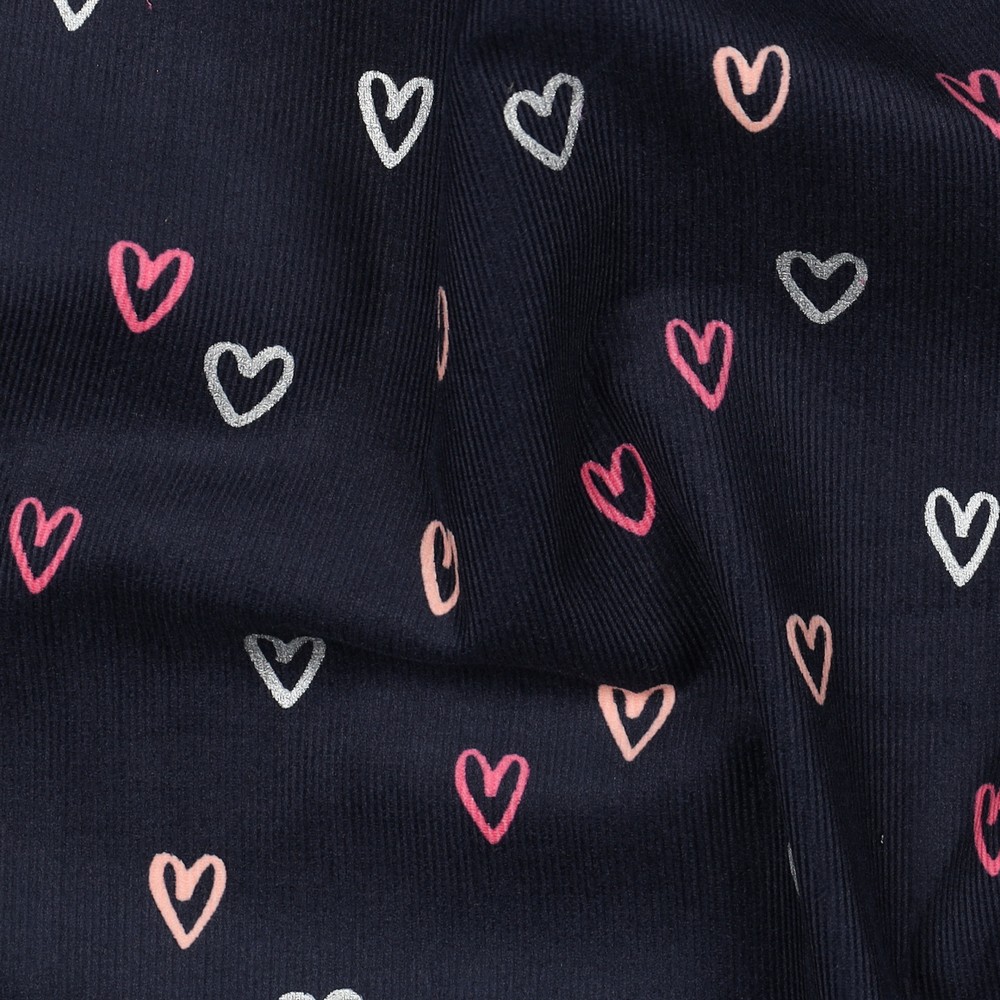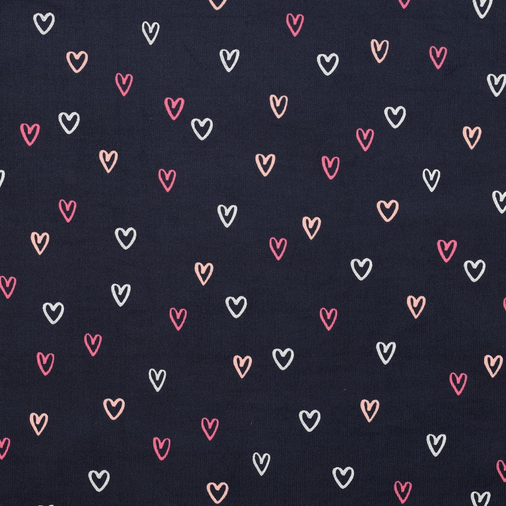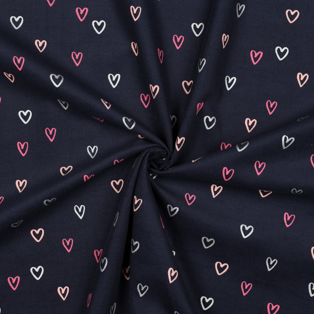 Fin babymanchester i klassisk marinblå färg, prickig med massor av små vita hjärtan - som en mjuk stjärnhimmel i form av ett hjärta. Den fina ribbade strukturen ger tyget en härligt mjuk känsla och en lätt, livlig karaktär.