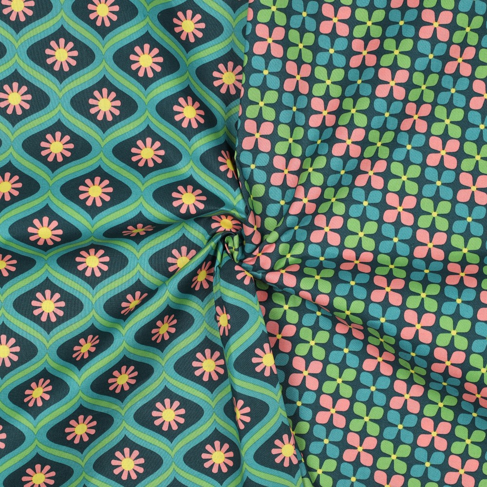 En frisk vårhälsning till ditt syprojekt: På en ljust grön bakgrund dansar små, lekfulla blommor i vitt och gult, med fina blad och prickar emellan som ger designen ett levande men ändå lugnt uttryck. Mönstret känns lätt, glatt och tidlöst – perfekt för alla som gillar romantiskt men inte kitschigt.