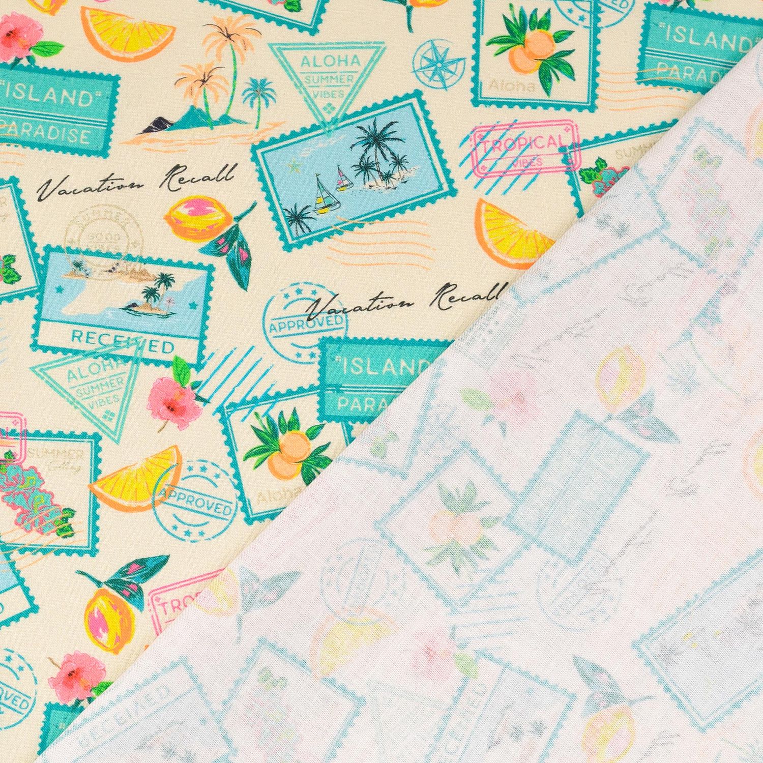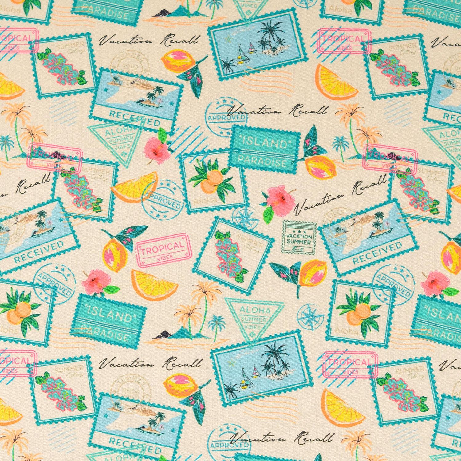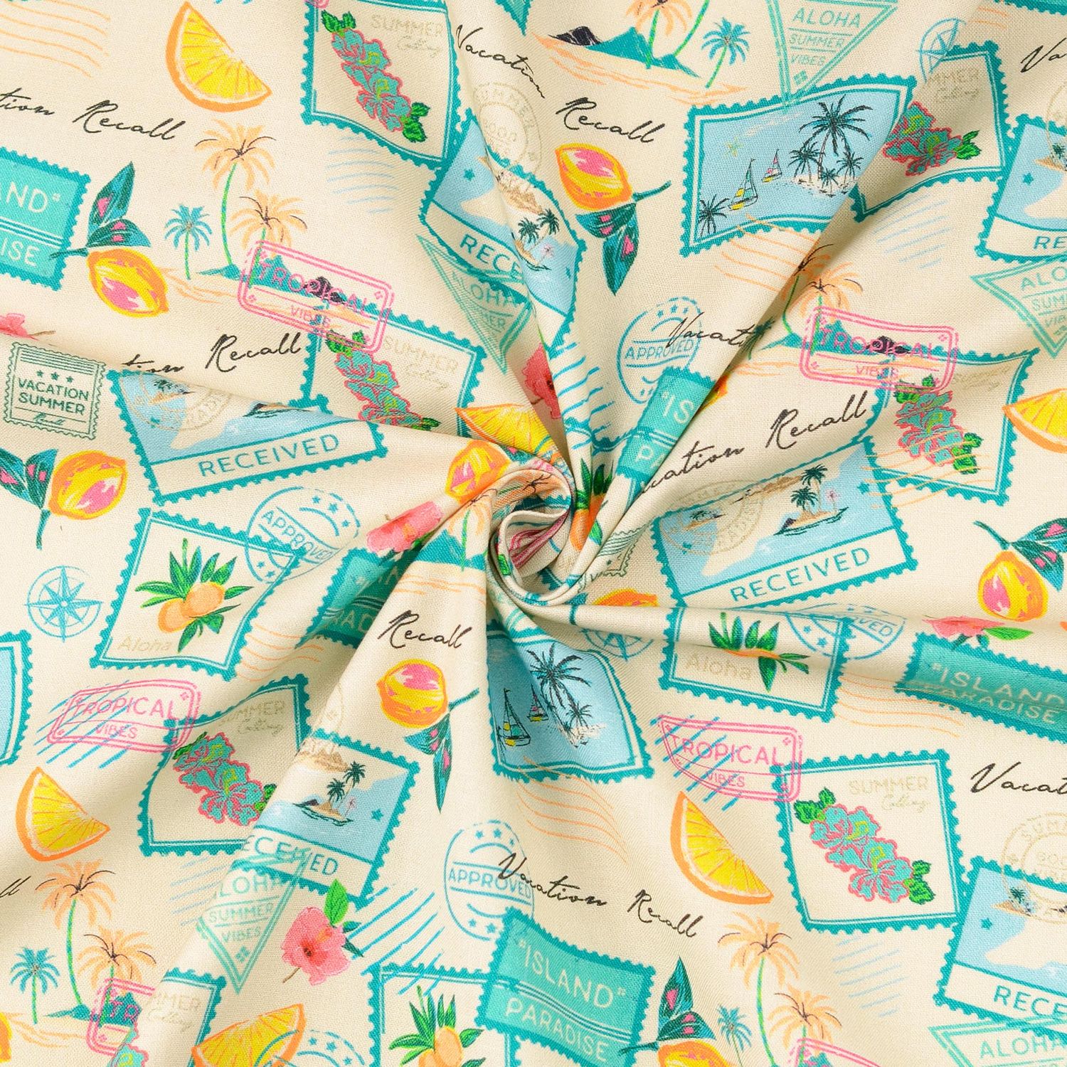 Detta tyg inbjuder till drömmar: På en varm sandton radas detaljerade frimärken upp – varje som ett litet semesterminne. Fina motiv av soliga resmål, nostalgiska stämplar och mjuka texter ger designen en charmig vintage-känsla, som om en hel samling vykort fångats på tyg.