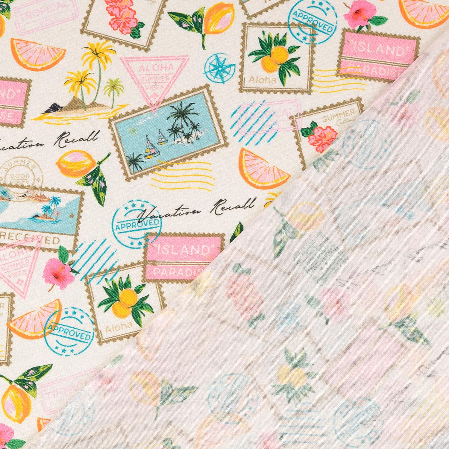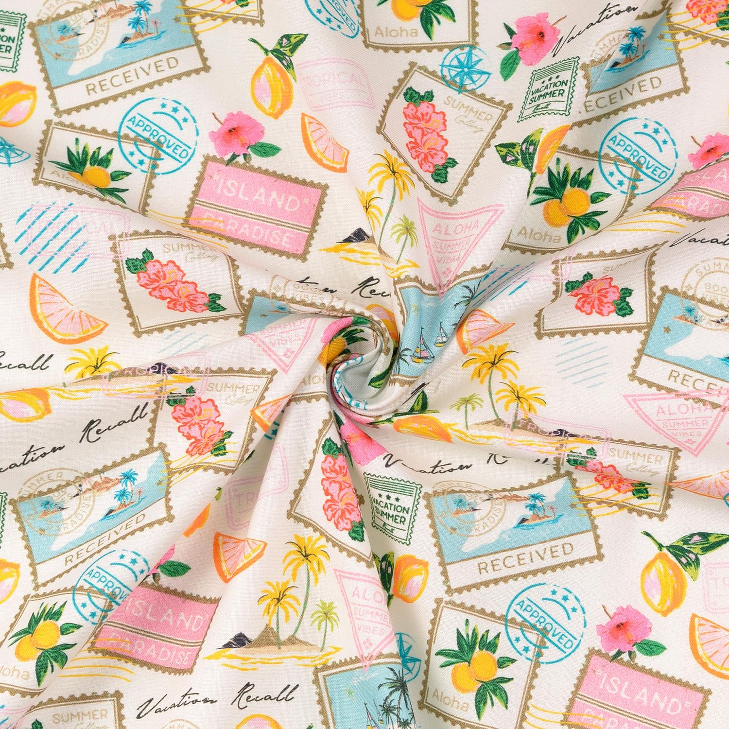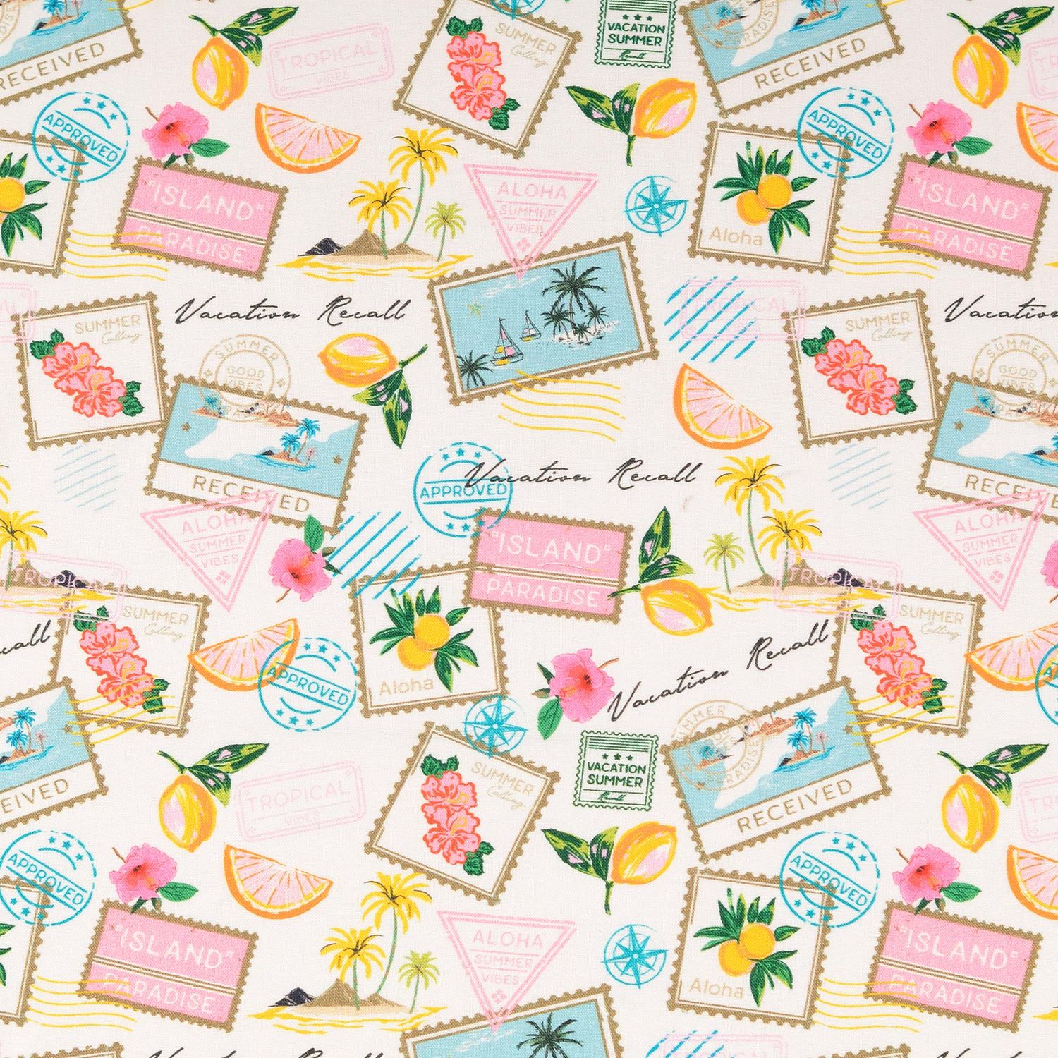 Bomullscretonne - Digitaltryck frimärken semester vit