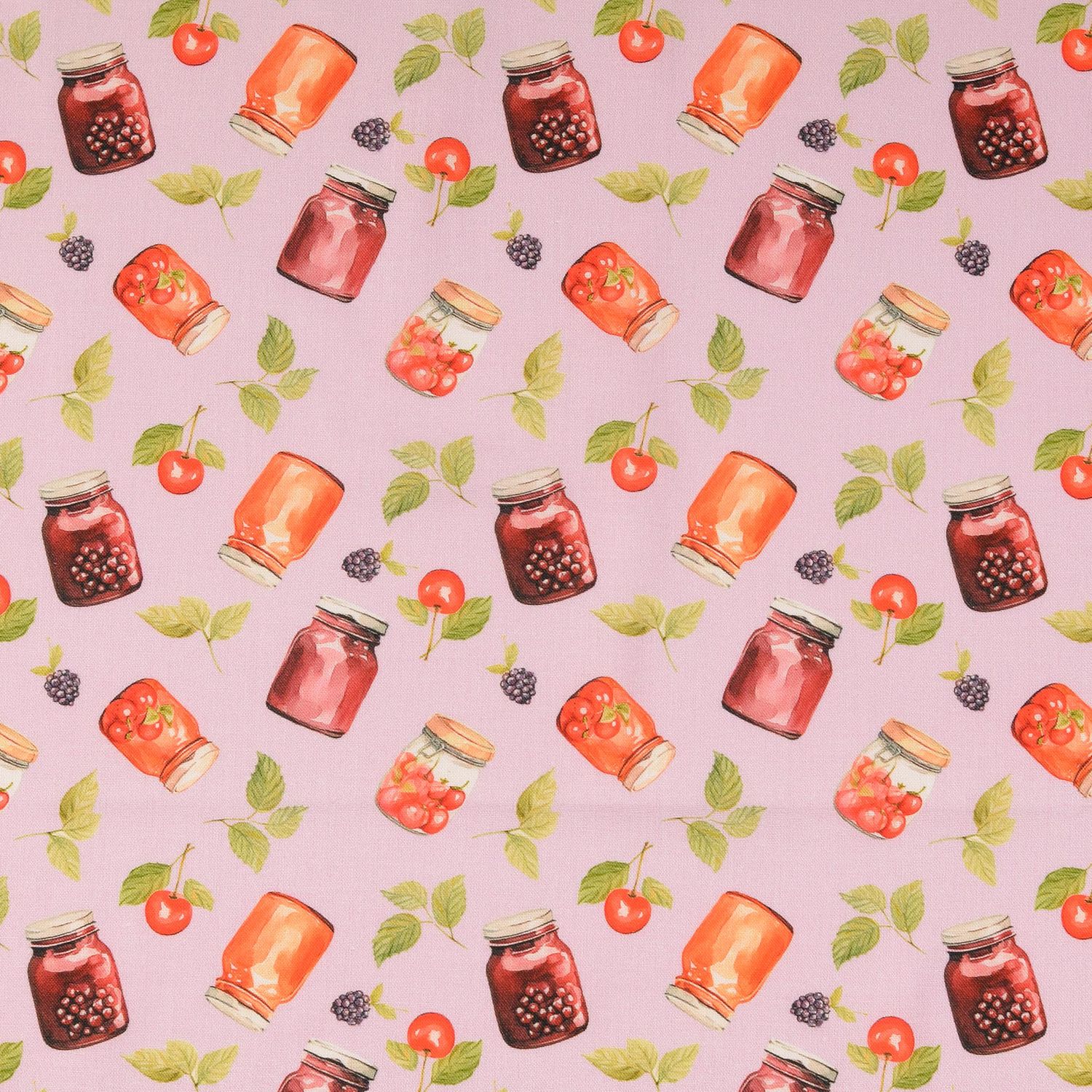 En kärleksfullt designad skafferi på tyg: På denna förtrollande cretonne står glas med frukt och grönsaker på rad – som hemgjorda och omsorgsfullt placerade i hyllan. Saftiga tomater, färska gurkor, färgglada paprikor, lysande citrusfrukter och bär trängs i dekorativa glas och flaskor, detaljerat och modernt utförda i digitaltryck.