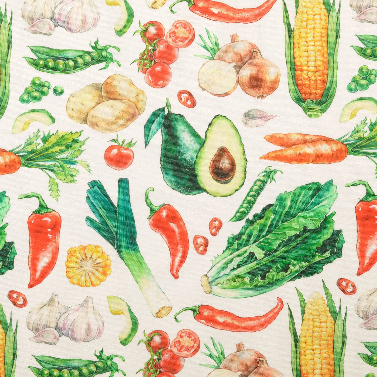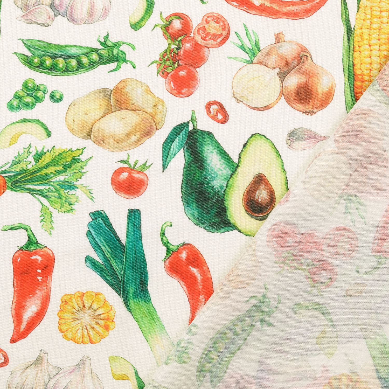 En fräsch marknadsstånd för ditt syrum: På en strålande vit bakgrund myllrar det av ett färgglatt urval av grönsaker – detaljerat utformat i digitaltryck. Saftiga tomater, krispiga morötter, lysande paprikor och många andra sorter ger tyget livfulla färger som rött, orange, grönt och gult och skapar genast en glad stämning.