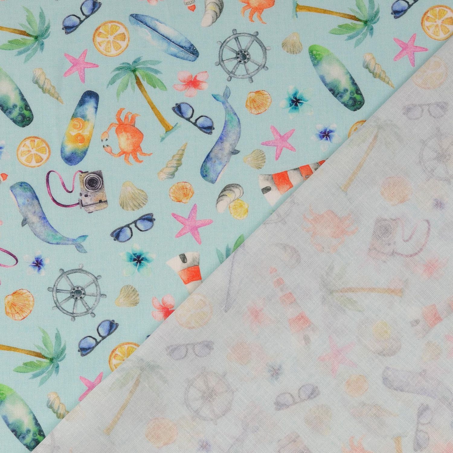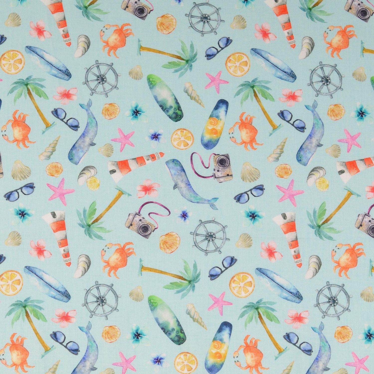 Bomullscretonne - digitaltryck Semester vid havet ljusblå