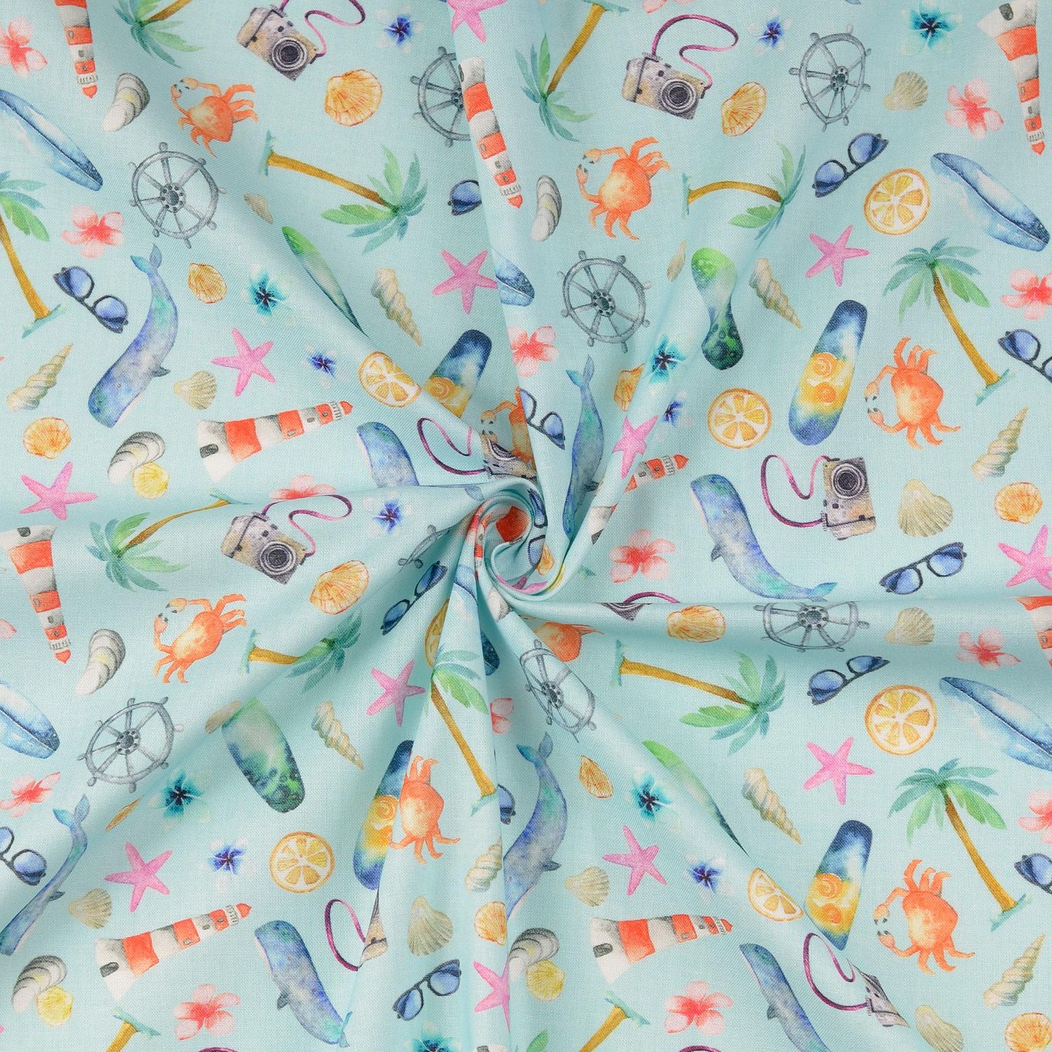 Detta tyg tar med sig semesterkänslan direkt hem till dig: mot en mjuk ljusblå bakgrund rör sig kärleksfullt illustrerade motiv kring sol, strand och hav. Små hus, båtar, palmer, fyrar och glada semestermotiv i harmoniska pastelltoner ser ut som ur en somrig skissbok – lekfulla, lätta och fulla av längtan.