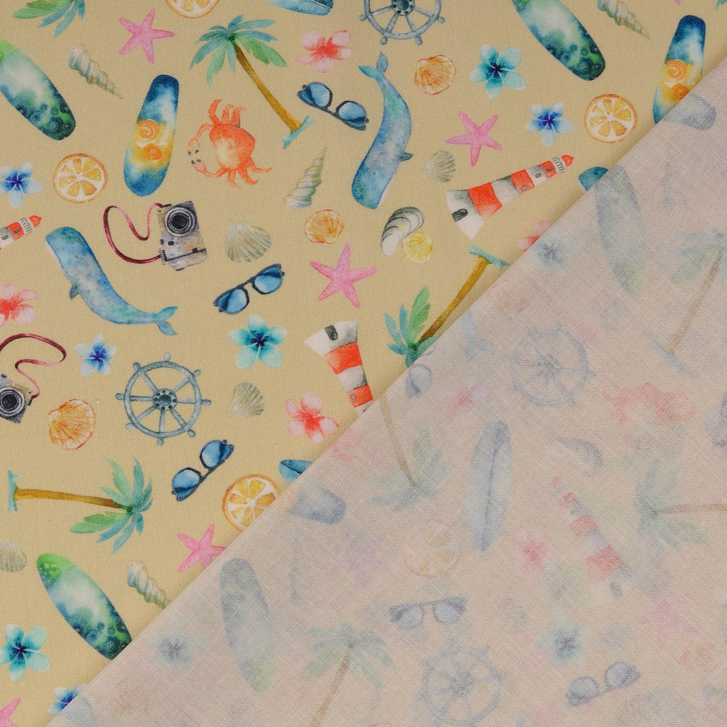 Fina snäckor, strandhus, båtar eller solstolar (beroende på motiv synliga i utsnittet) är detaljerat fångade i digitaltryck och ser nästan målade ut. Den harmoniska färgpaletten av beige, creme, blått och mjuka pastellfärger skapar en lugn, somrig atmosfär.