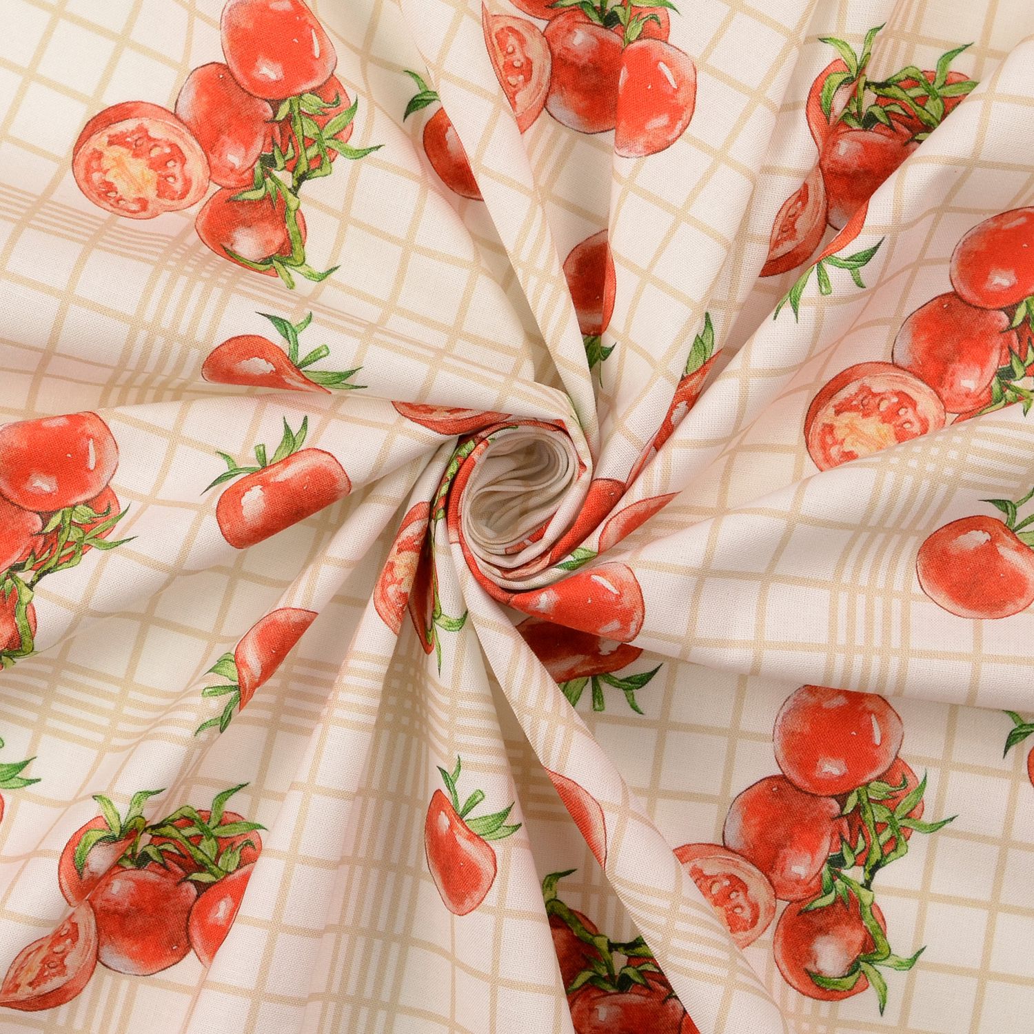 Tyg som en solig marknadsdag i Italien: På den ljusa, varma vit-beige tonen lyser saftiga röda tomater i olika varianter – hela tomater, halvor och skivor, detaljerat och realistiskt framställda i digitaltryck. Fina skuggningar och små highlights gör att frukterna nästan verkar tredimensionella, som om de kunde plockas direkt från tyget.