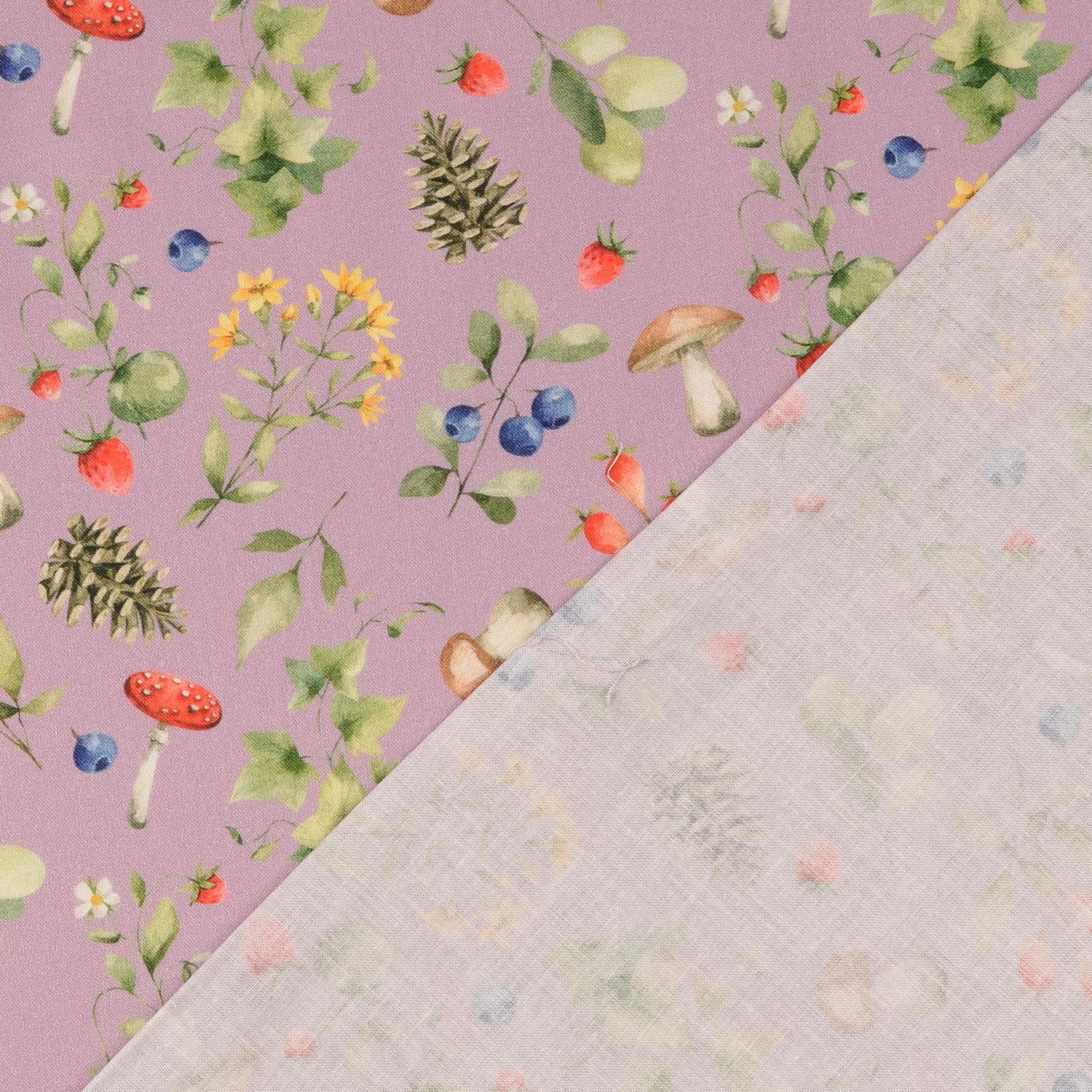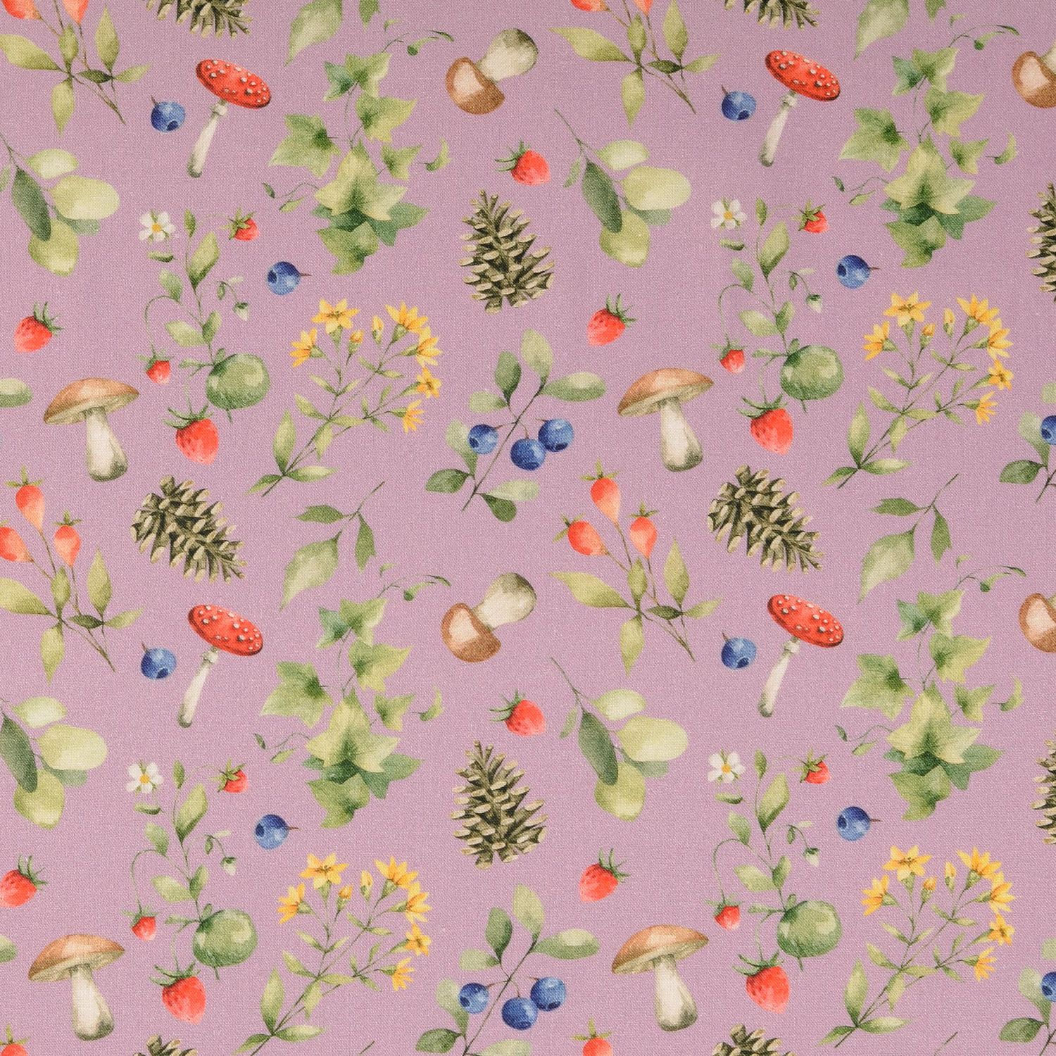 En sagolik promenad genom skogen – direkt på ditt tyg: mjuka skogsbär i varma röda och bärtoner möter fint ritade blad och små kvistar. Den detaljrika digitaltryckta designen gör att varje bär nästan känns påtagligt.