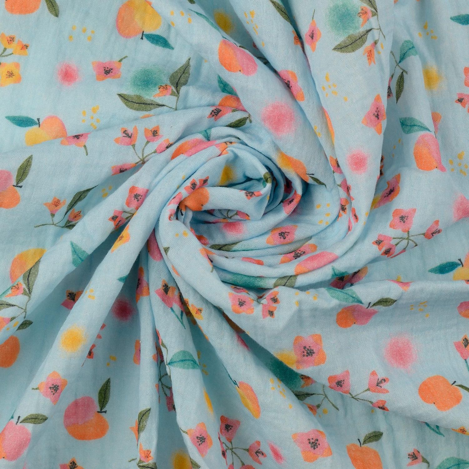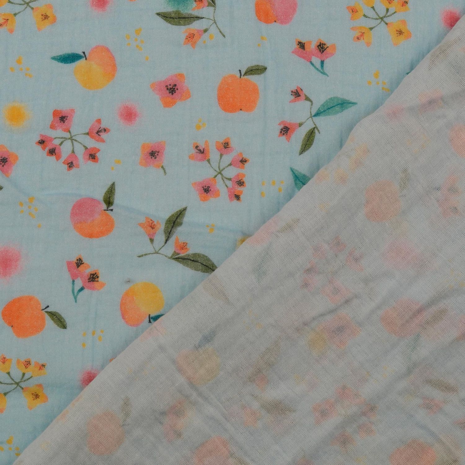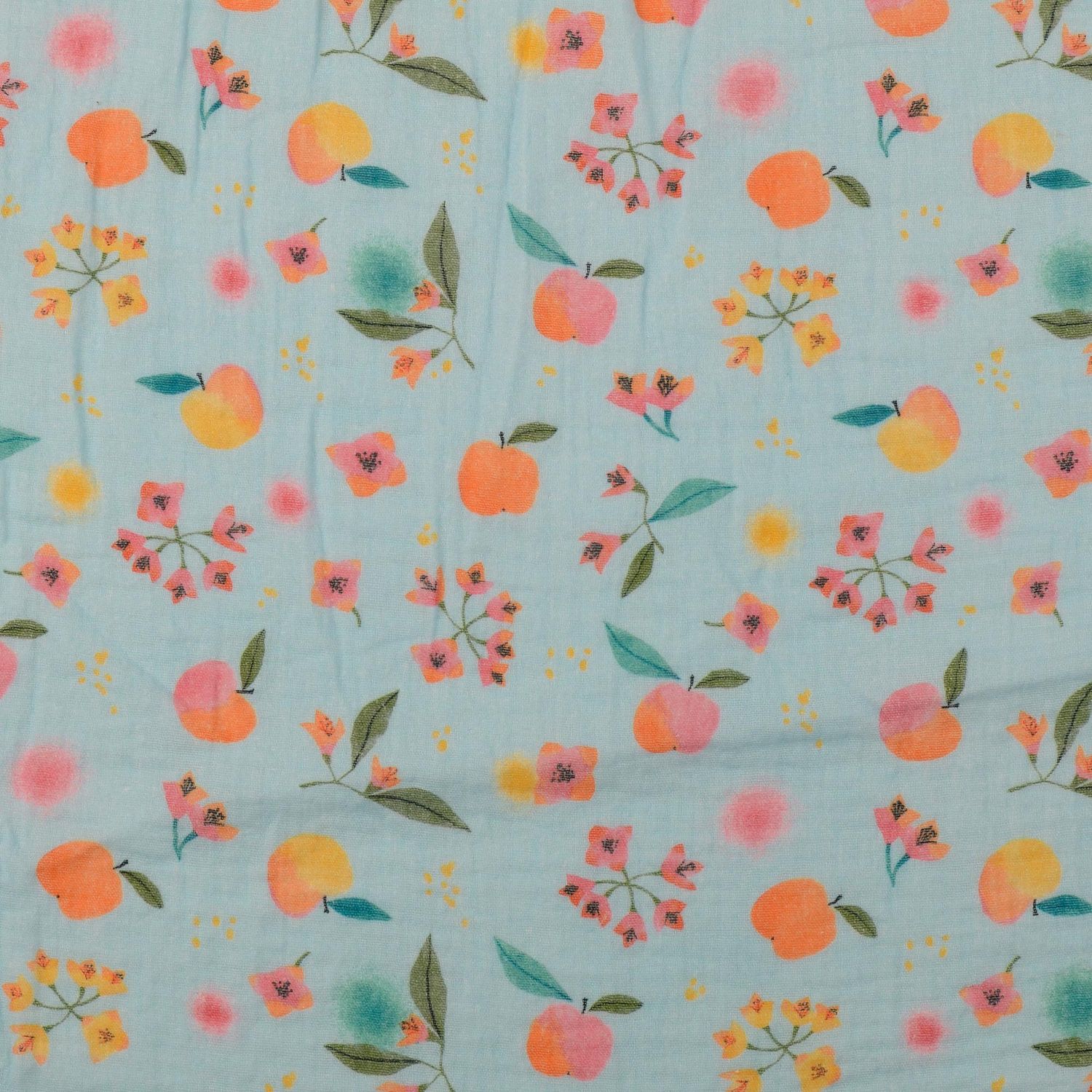 Bomullsmusselin - Double Gauze digitaltryck äpplen och blommor ljusblå