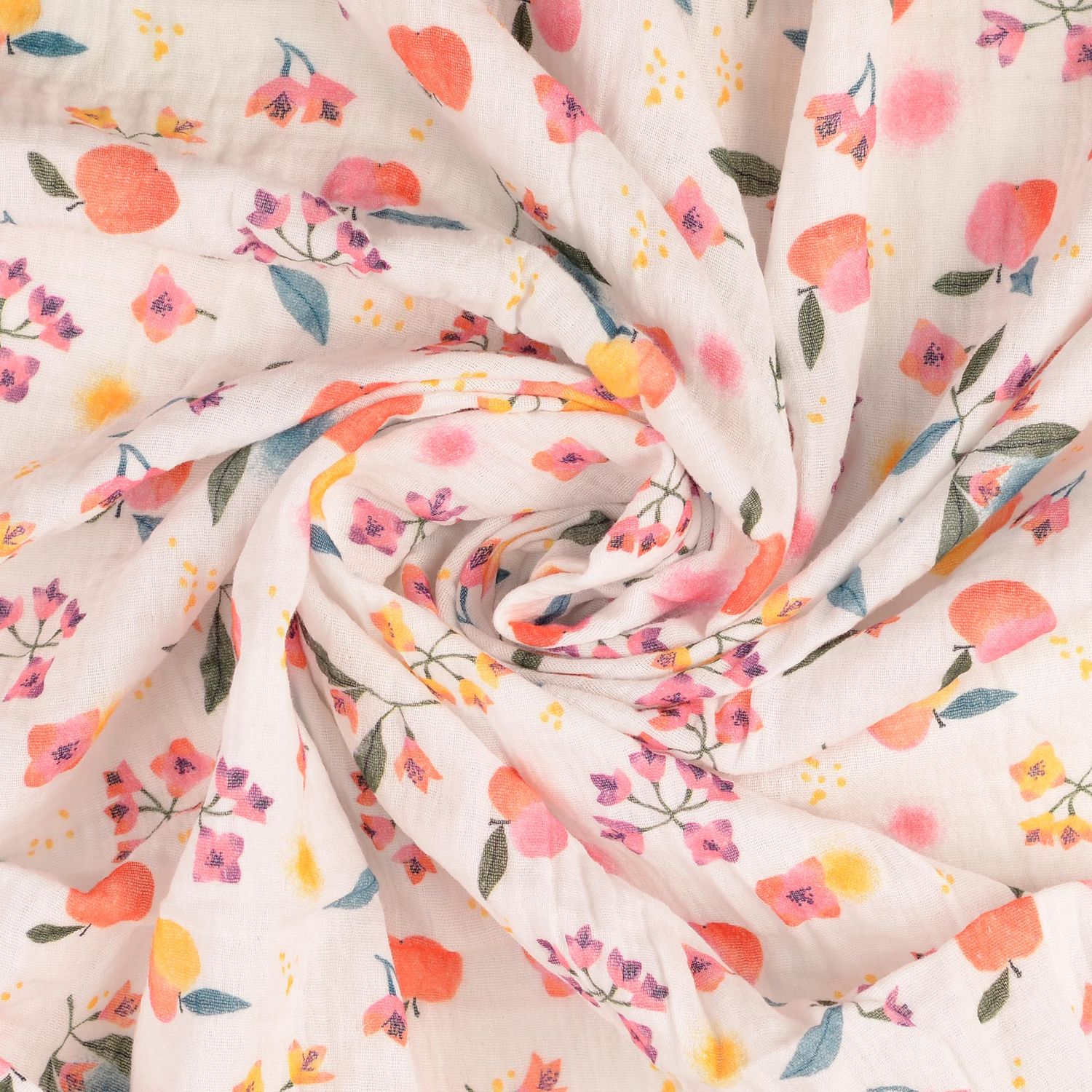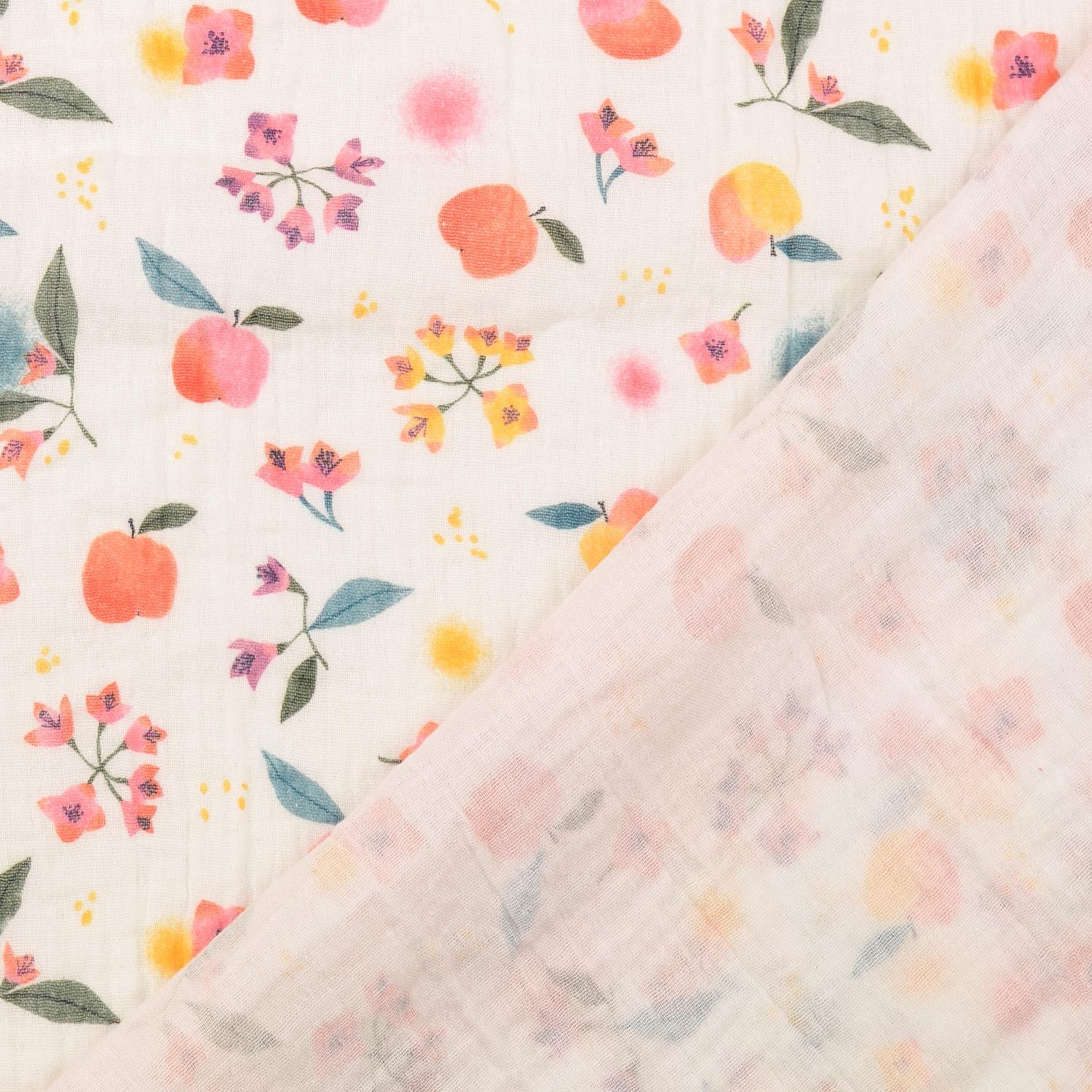 Bomullsmusselin - dubbel gaze digitaltryck äpplen och blommor vit