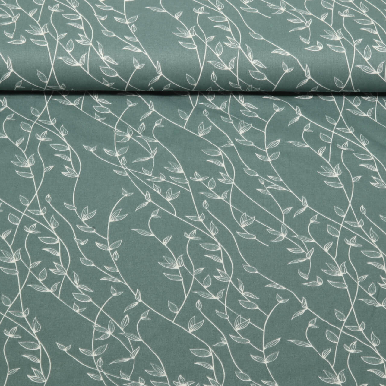 Ett tyg som en promenad genom en mystisk skog: fina, ljusare blad i fina gröna och krämfärgade nyanser slingrar sig uppåt på en djupt mörkgrön bakgrund. Bladens filigrana rankor löper harmoniskt över hela ytan och ger designen en elegant, naturlig lätthet - varken för lekfull eller för iögonfallande, utan behagligt lugn och stilren.
