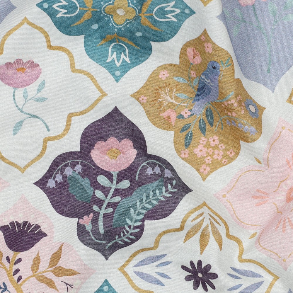 Detta förtrollande tyg förenar charmen hos kärleksfullt designade lappar med en frisk, blommig design. På en strålande vit bakgrund ligger små „tygfält” sida vid sida – var och en med sitt eget, detaljerade blommotiv. Ömtåliga blommor, fina blad och lekfulla rankor i harmoniska färger som rosa, rött, gult, grönt och diskreta blå nyanser ger ett glatt men ändå elegant utseende.