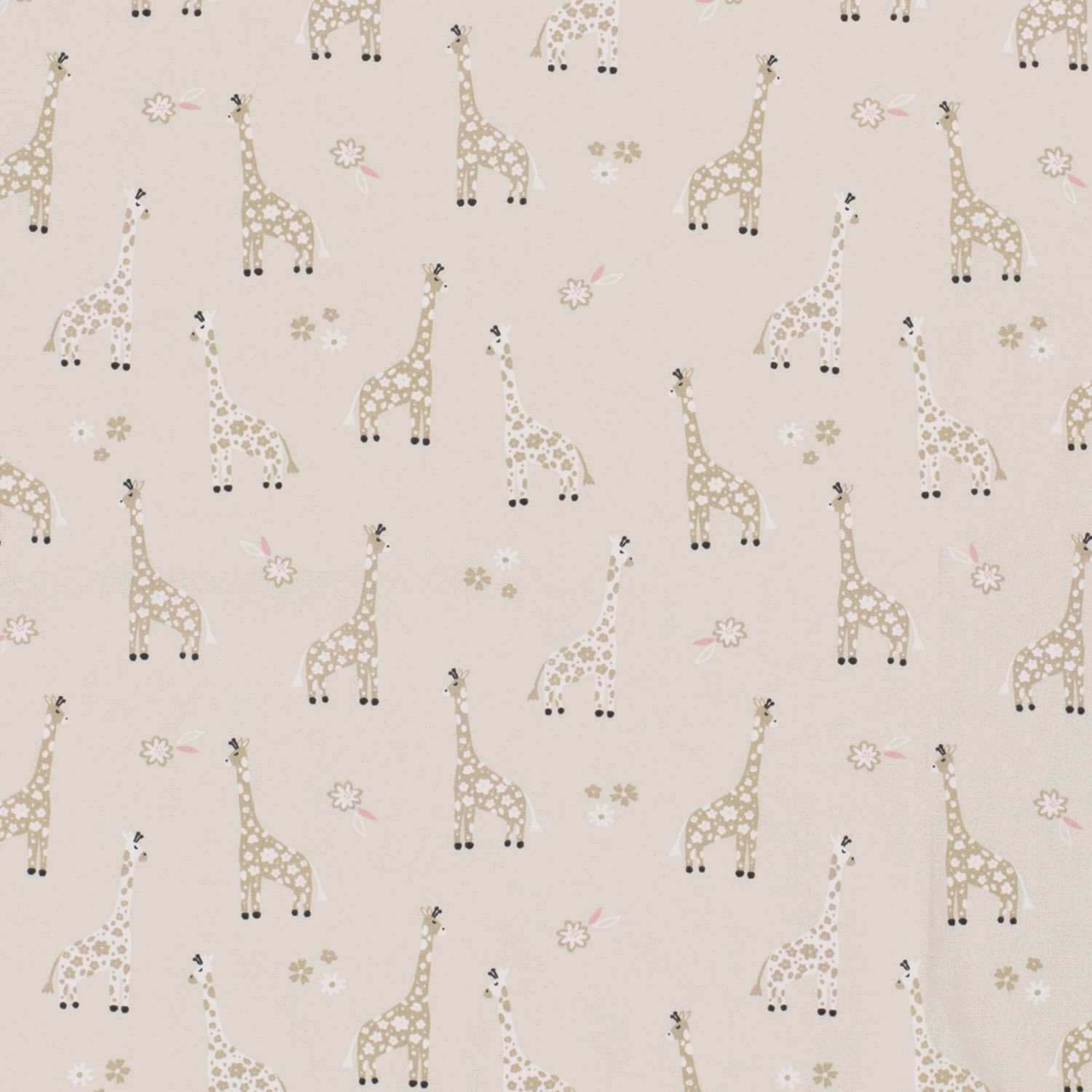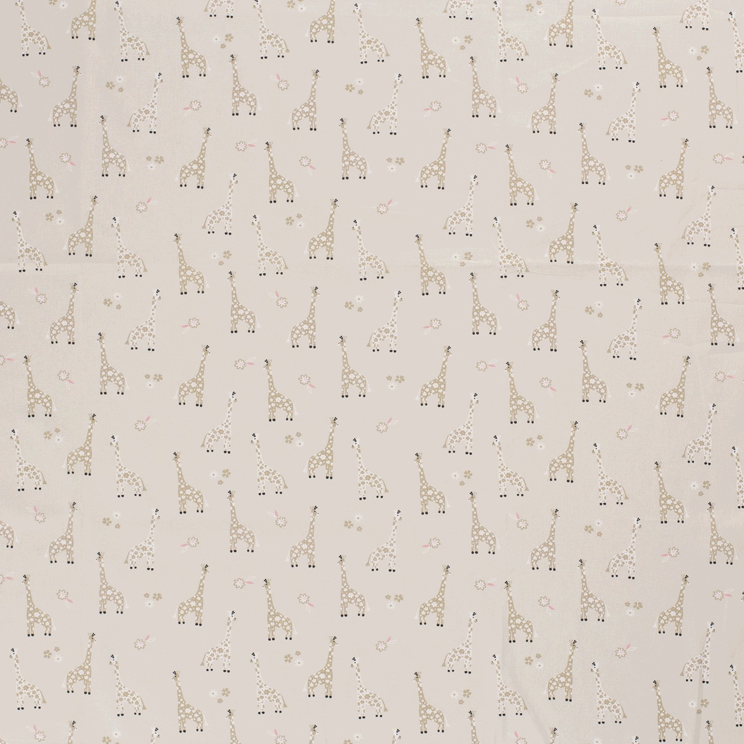 Den lekfulla designen med de söta girafferna och små blommorna passar utmärkt för baby- och barnkläder, sängkläder, sängkantsskydd, kuddar eller mysiga accessoarer till barnrummet. Även för dekorationsprojekt som vimplar, förvaringskorgar eller tygkorgar är detta tyg perfekt om du vill skapa en kärleksfull, naturlig atmosfär.
