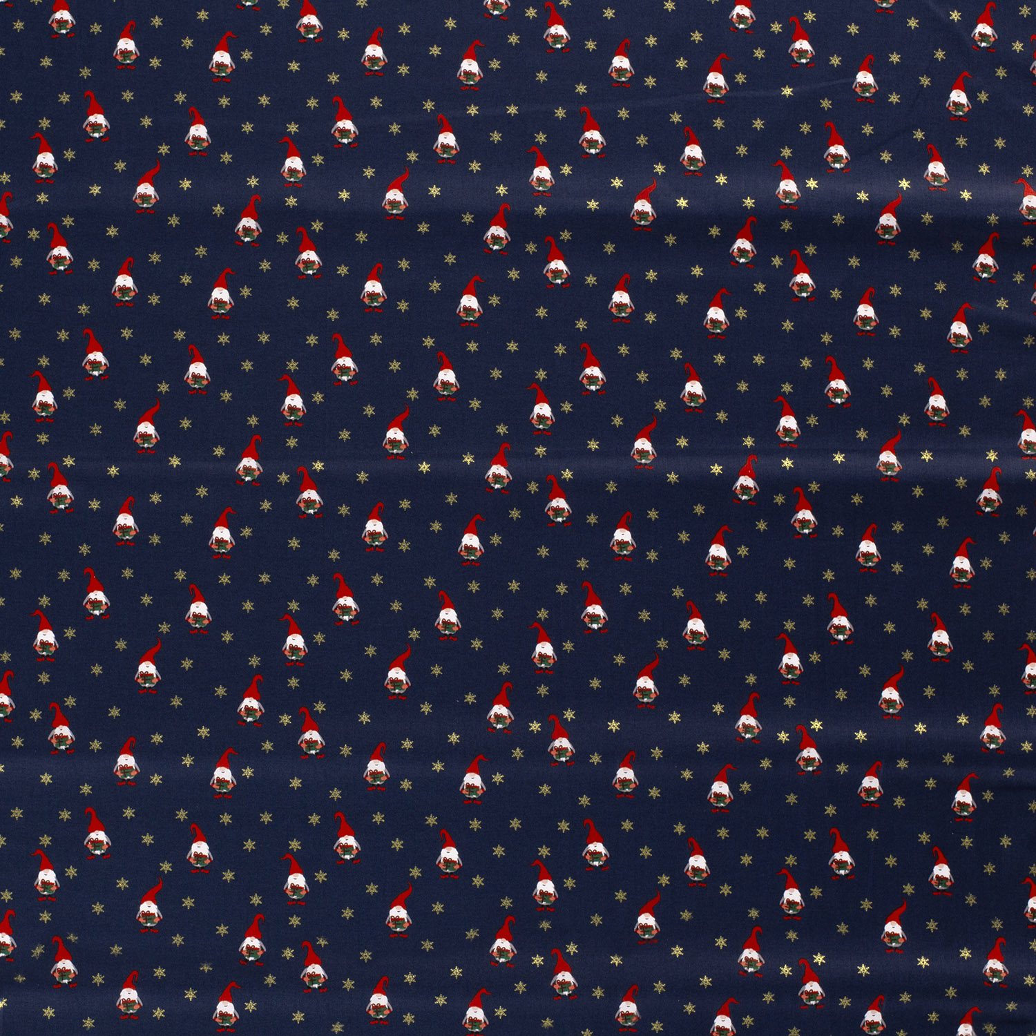 Tyg som från julverkstaden: På en djup navyblå bakgrund leker glada julnissar i sina rödvita luvor, omgivna av små stjärnor, paket och vinterdetaljer. De klara, lysande färgerna kommer särskilt fint till sin rätt på den mörkblå bakgrunden och ger designen en mysig, festlig atmosfär.