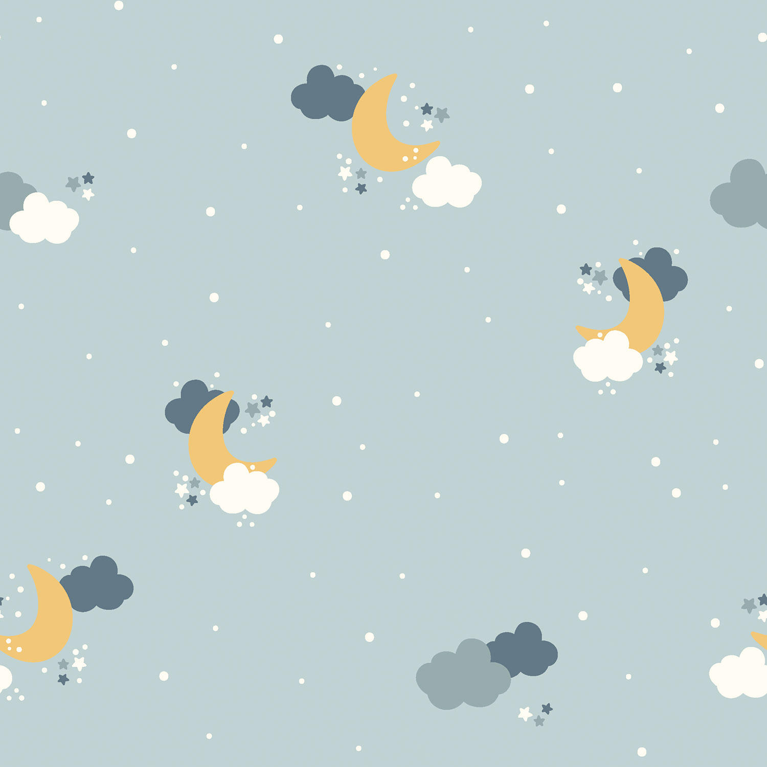 En skir sommarhimmel fångad på tyg: små, stiliserade solar, månar och stjärnor i varma gula och orange toner lyser mot den mjuka ljusblå bakgrunden. Fina linjer och vackra detaljer påminner om drömska barnboksillustrationer och ger designen en lekfull men ändå lugn aura.