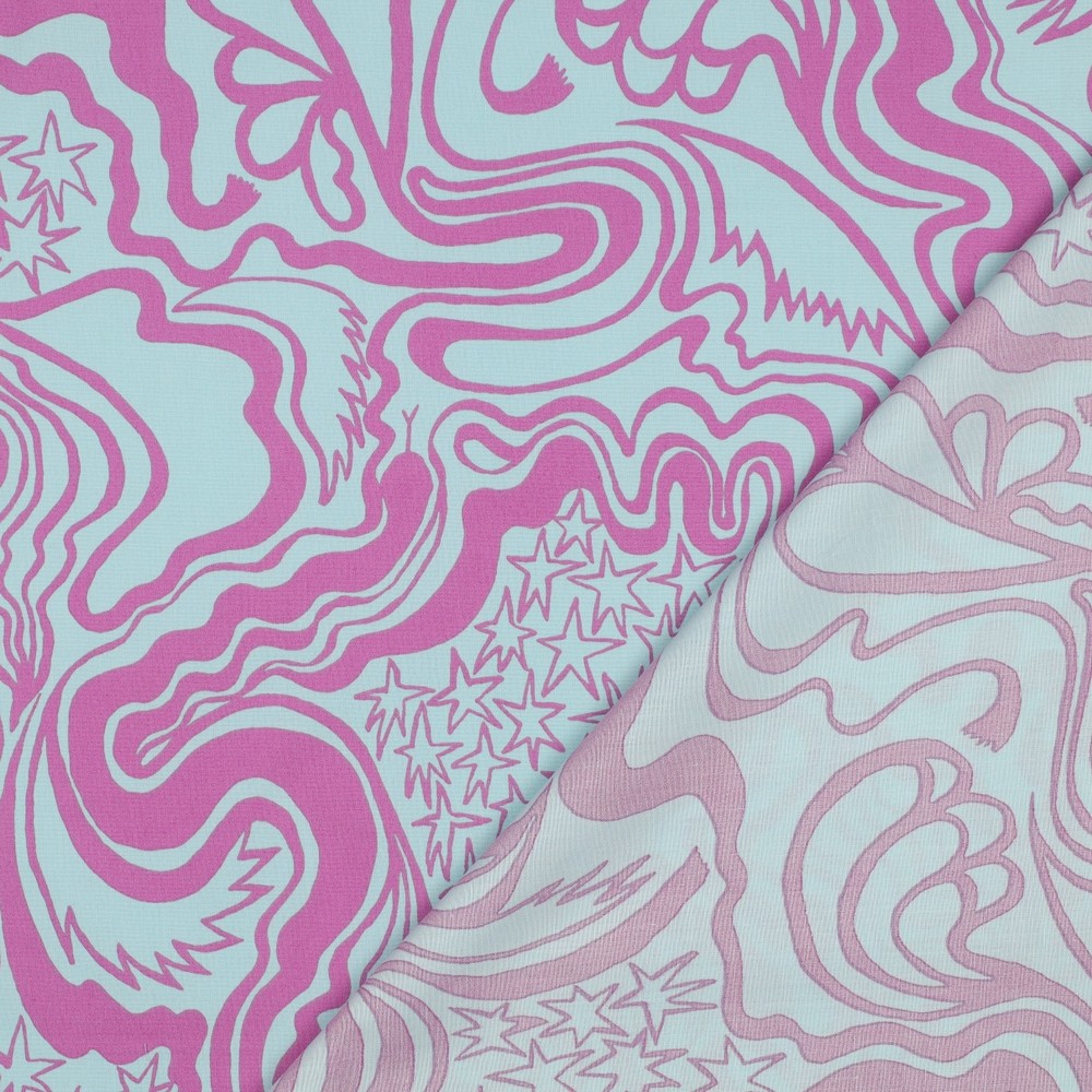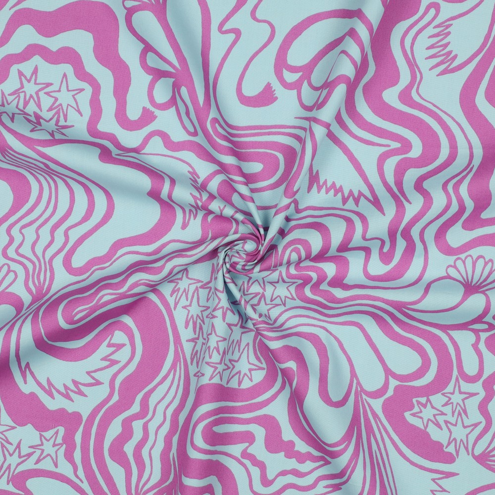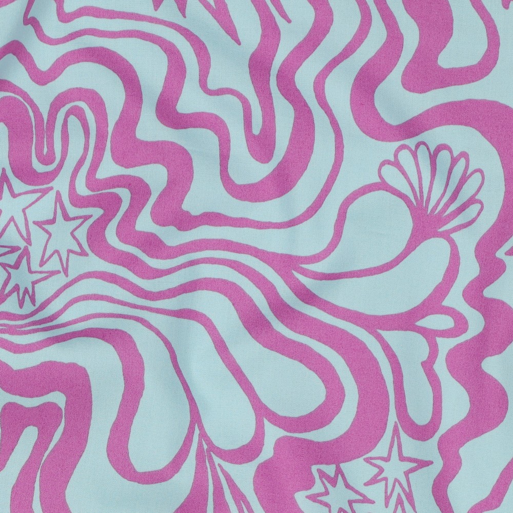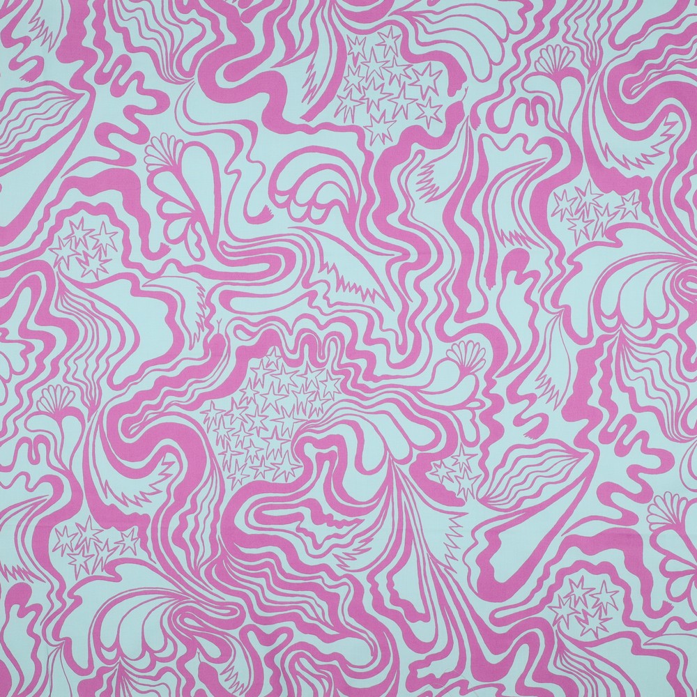 Delikat mint möter modern konst: detta tyg av designern Nerida Hansen är en fröjd med ett livfullt allover-tryck i glada, klara färger. Lekfulla former och grafiska element i varma nyanser av rosa, gult och blått dansar över den mintfärgade bakgrunden och ger designen en fräsch, kreativ look.