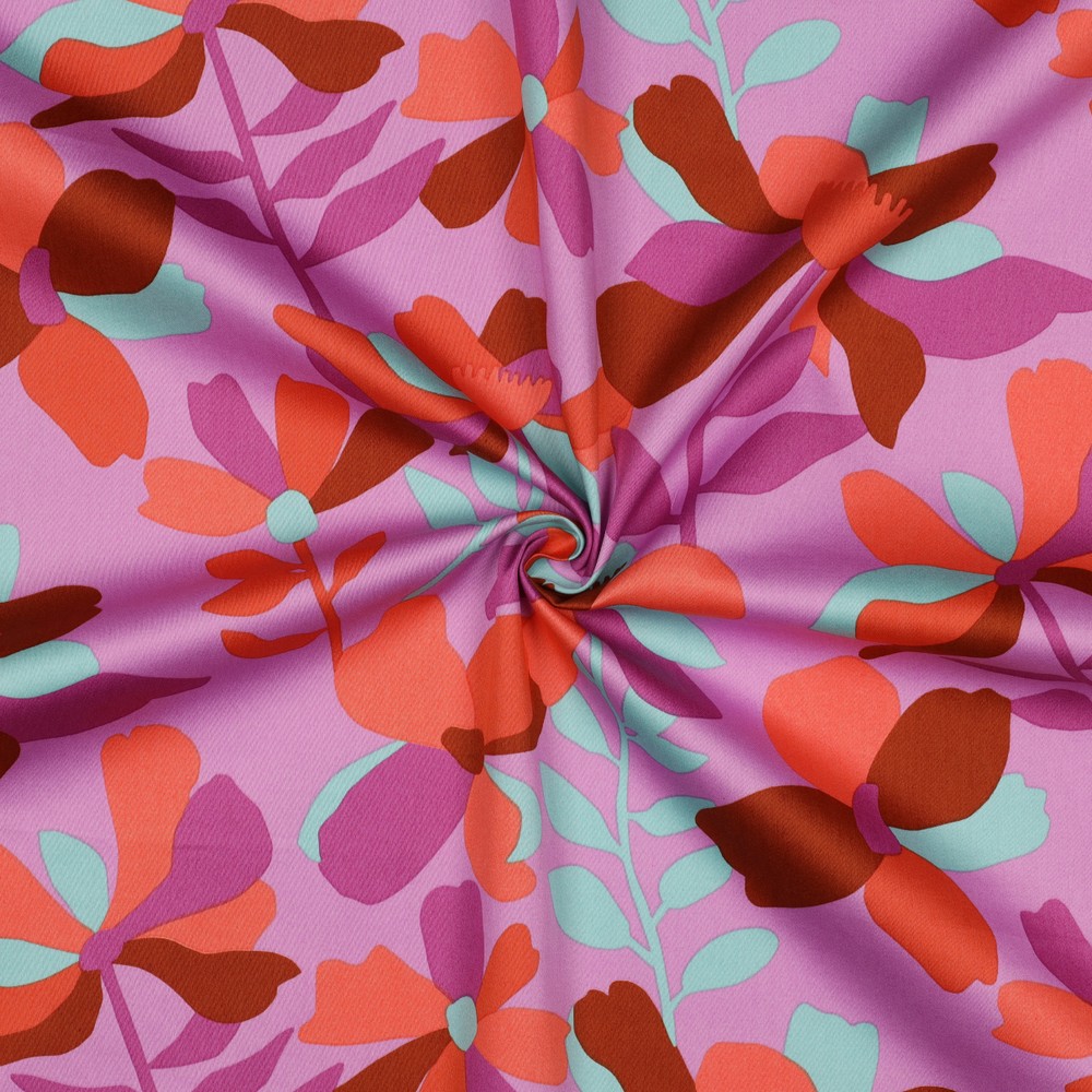 En touch av våräng på elegant satin: detta tyg från Nerida Hansen förtrollar med ett livligt hav av blommor i delikata pastellfärger. Lekfulla blommor och skira blad slingrar sig över tyget och lyser i fräscha nyanser av lavendel, mjukt rosa och aprikos, accentuerade av glada gula och gröna toner. Den ljusa, vänliga bakgrunden låter blommönstret skina och ger tyget en modern, konstnärlig lätthet.