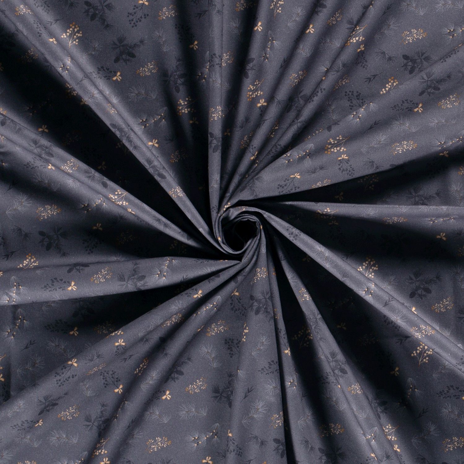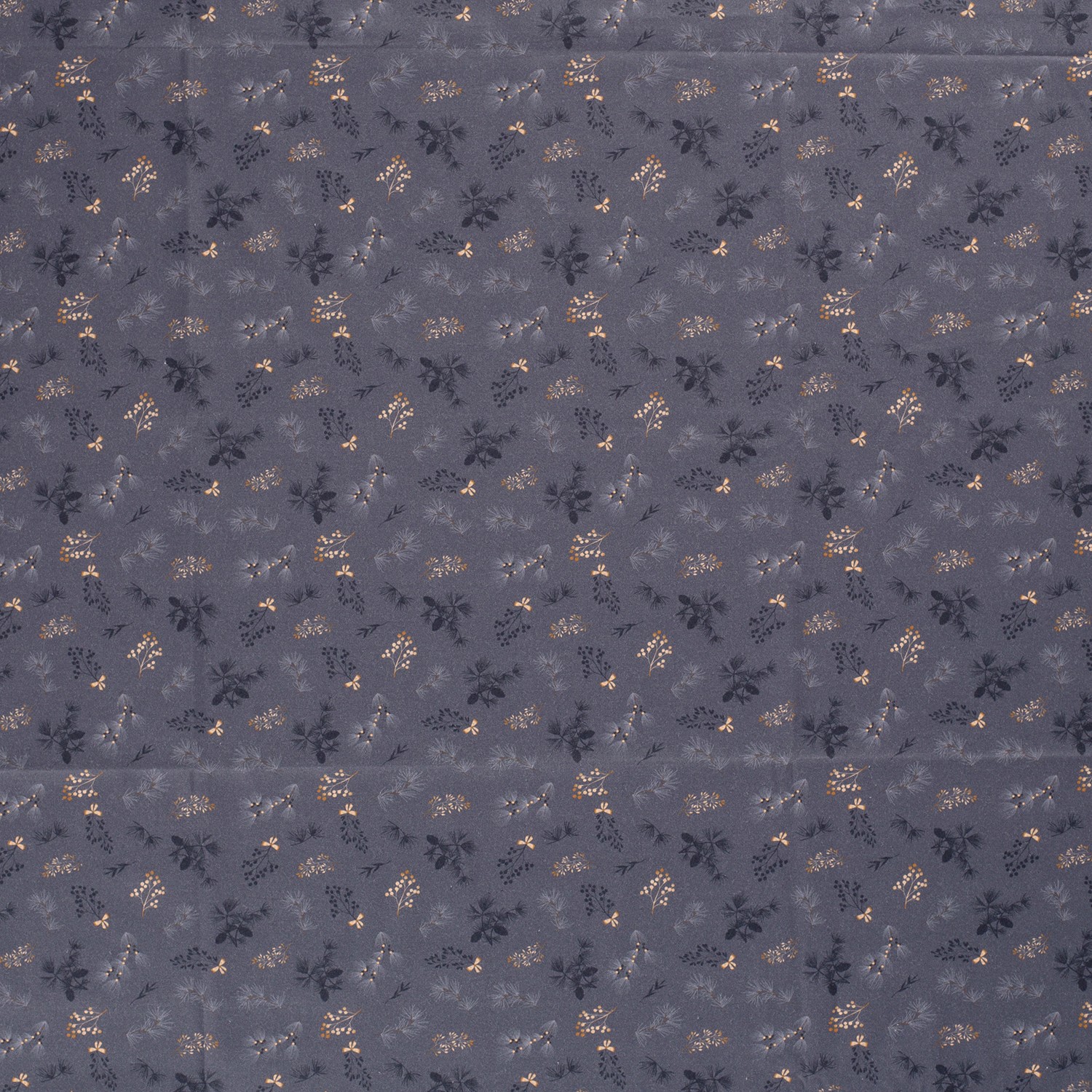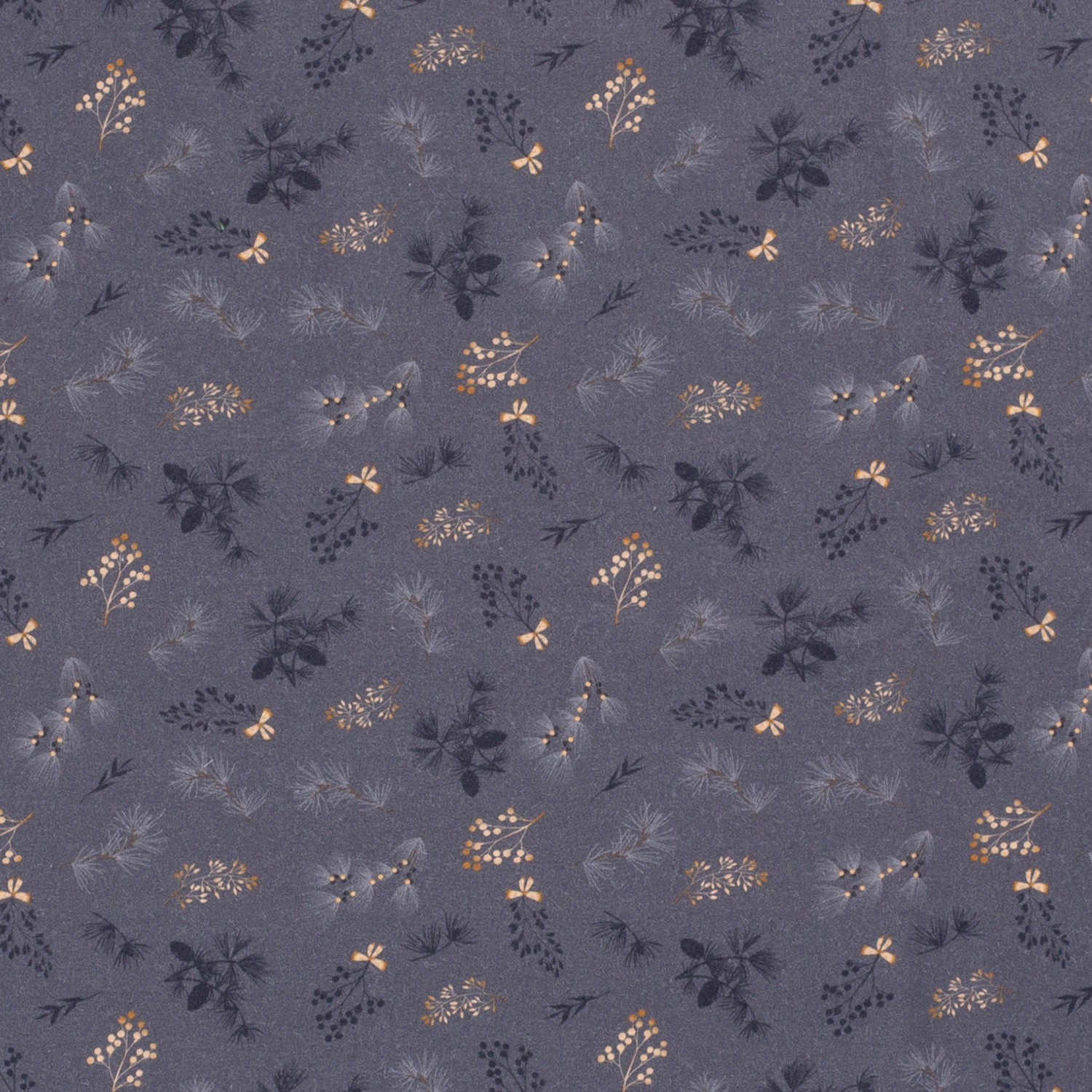 En touch av vintermagi för dina syprojekt: På en mjukt grå bakgrund slingrar sig fina grenar med små, stiliserade blad och bär i vitt och varma bruna och beige toner. Det diskreta men livfulla mönstret känns skandinaviskt klart och samtidigt mysigt – perfekt för den mysiga årstiden.