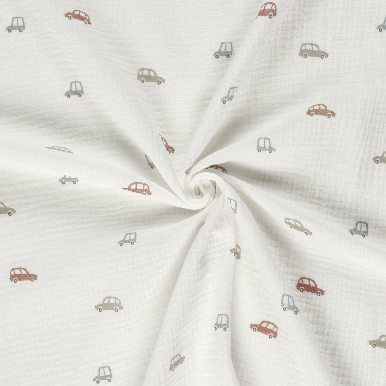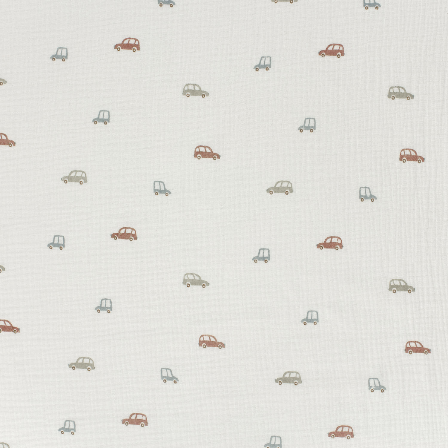 Ett tyg som en liten joyride genom barnkammaren: på den fina benvita bakgrunden kör kärleksfullt tecknade små bilar i mjuka nyanser av blått, grönt och rost lugnt över muslinet. Den subtila, luftiga designen ser lekfull ut utan att vara överlastad - perfekt för babyoutfits, barnkläder, mysiga filtar eller lätta filtar.