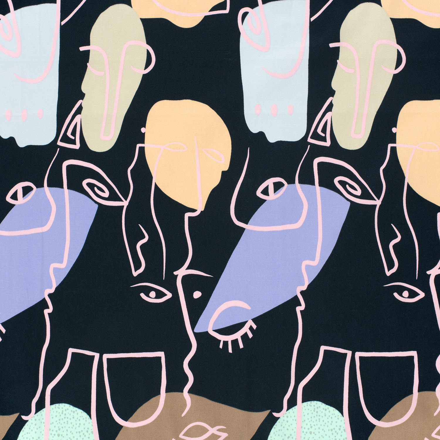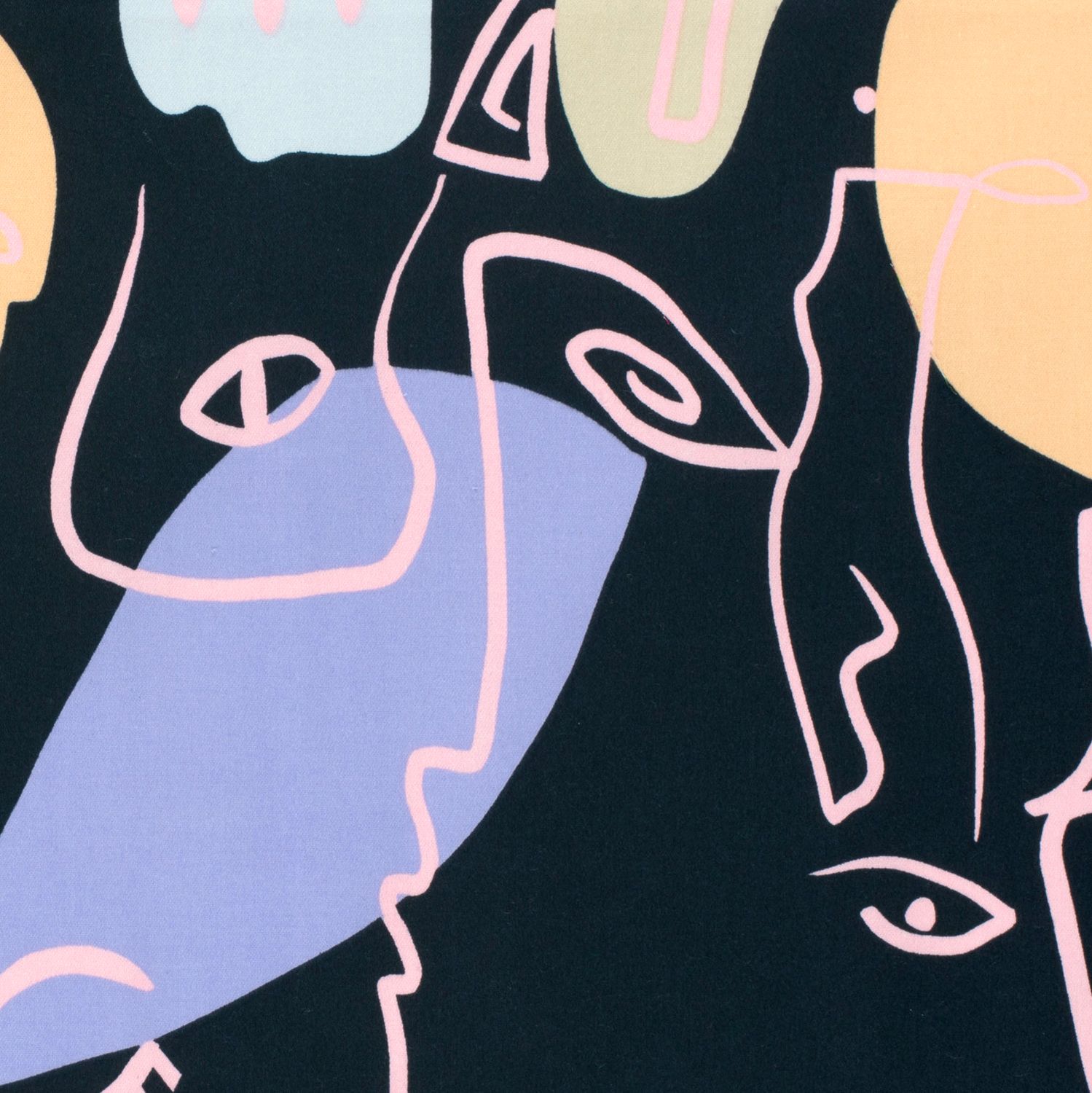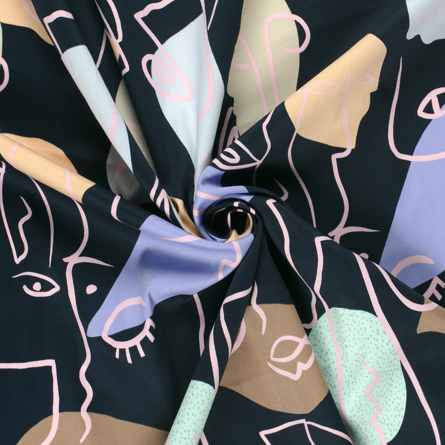 Denna elegant skimrande bomullssatin i djup marinblå drar all uppmärksamhet med sin unika ansiktsdesign. Mot den mörka bakgrunden sprids stiliserade ansikten i fina, ljusa linjer – ibland bara antydda, ibland tydligare – som små konstverk som bildar ett modernt, grafiskt mönster.