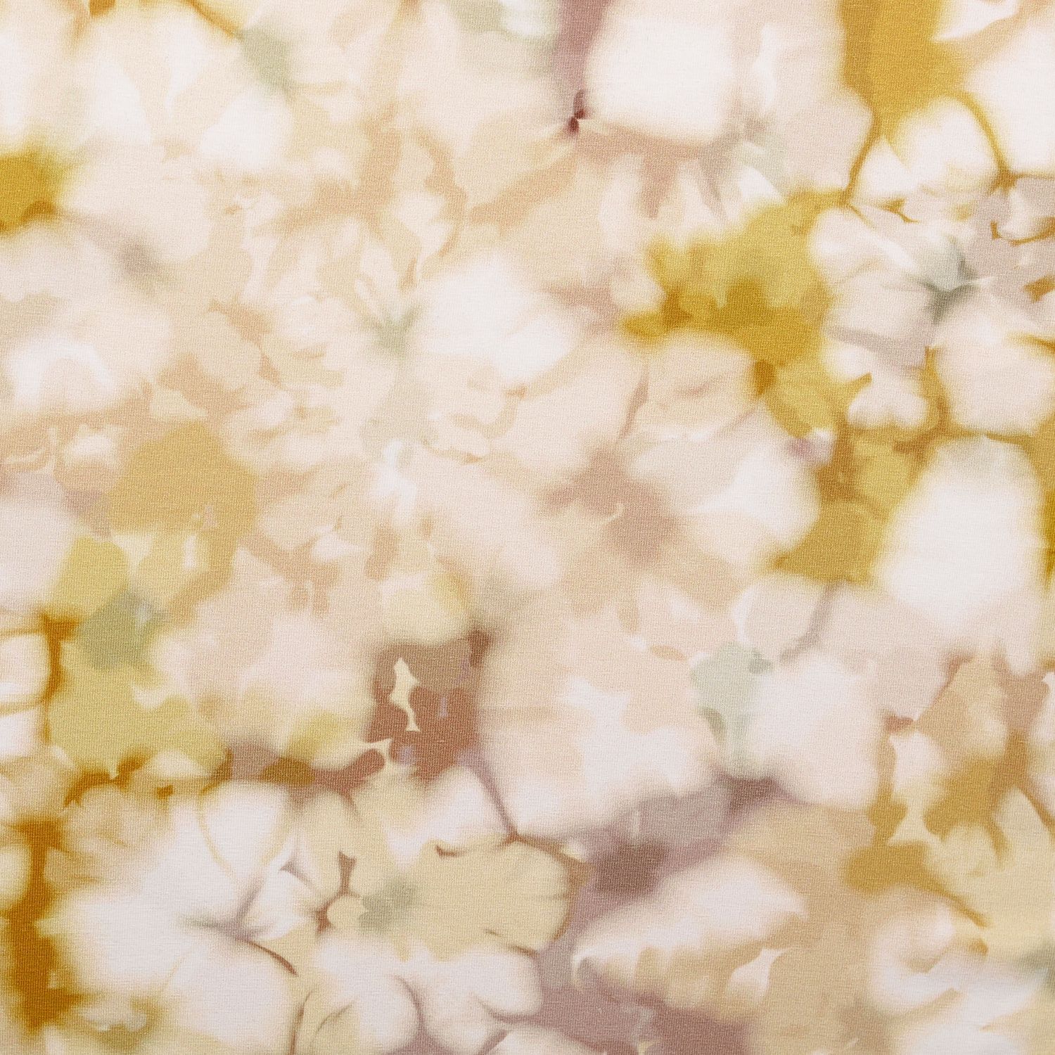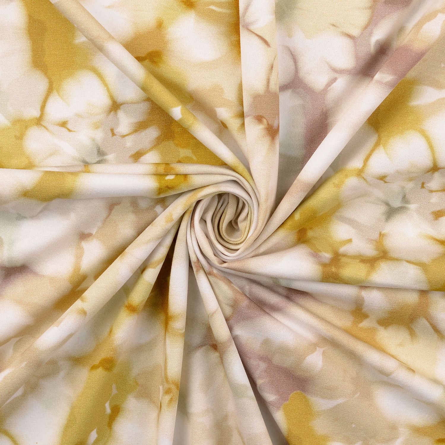 En touch av sensommar på tyget: Denna vackra jersey visar en levande batikdesign i varma ockratoner, genomdragen av mjuka övergångar och fina blomsteraccenter. De florala formerna liknar skira akvareller som harmoniskt sprider sig över tyget och ger det en konstnärlig, handgjord känsla.