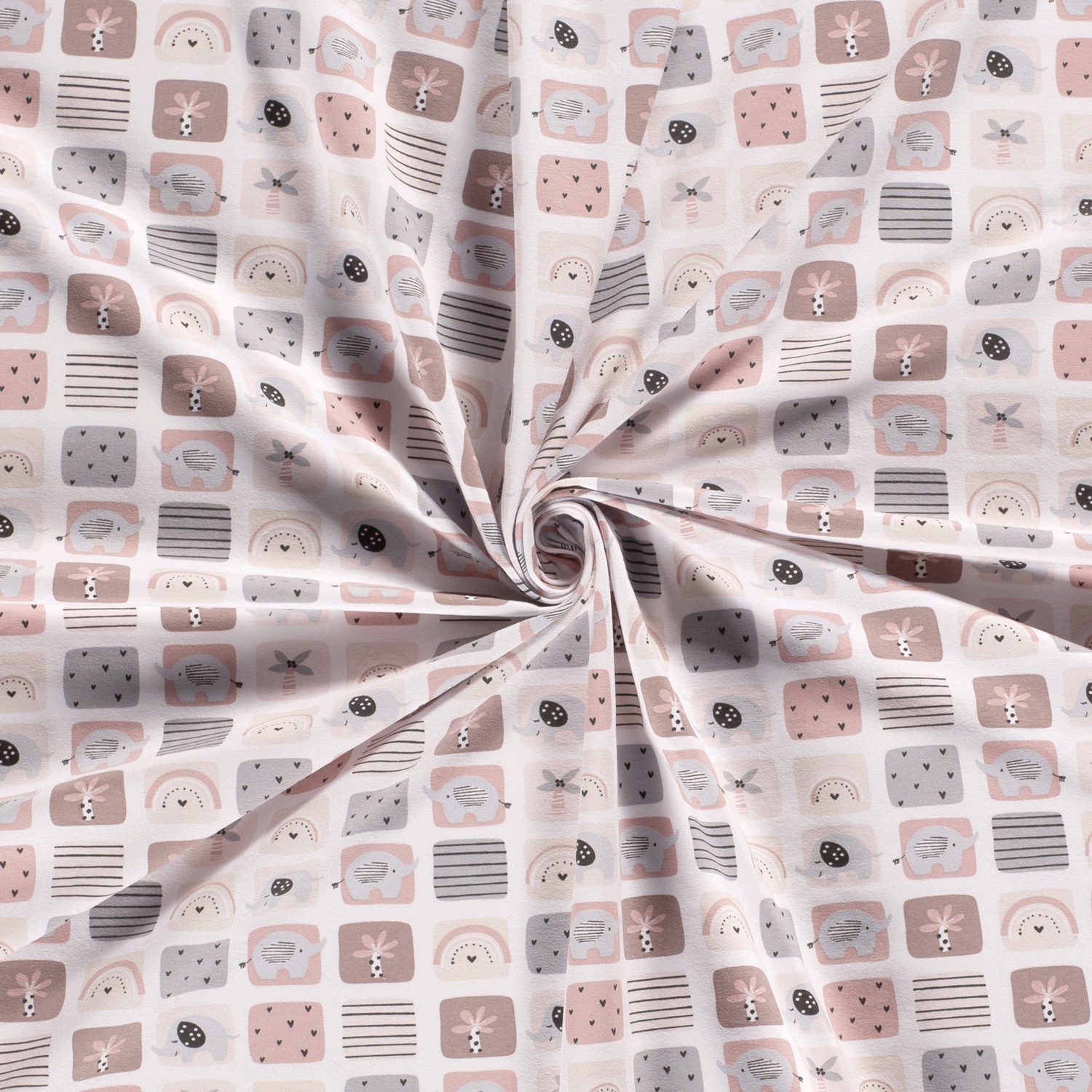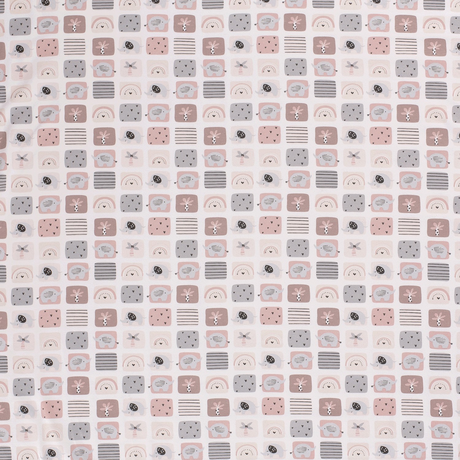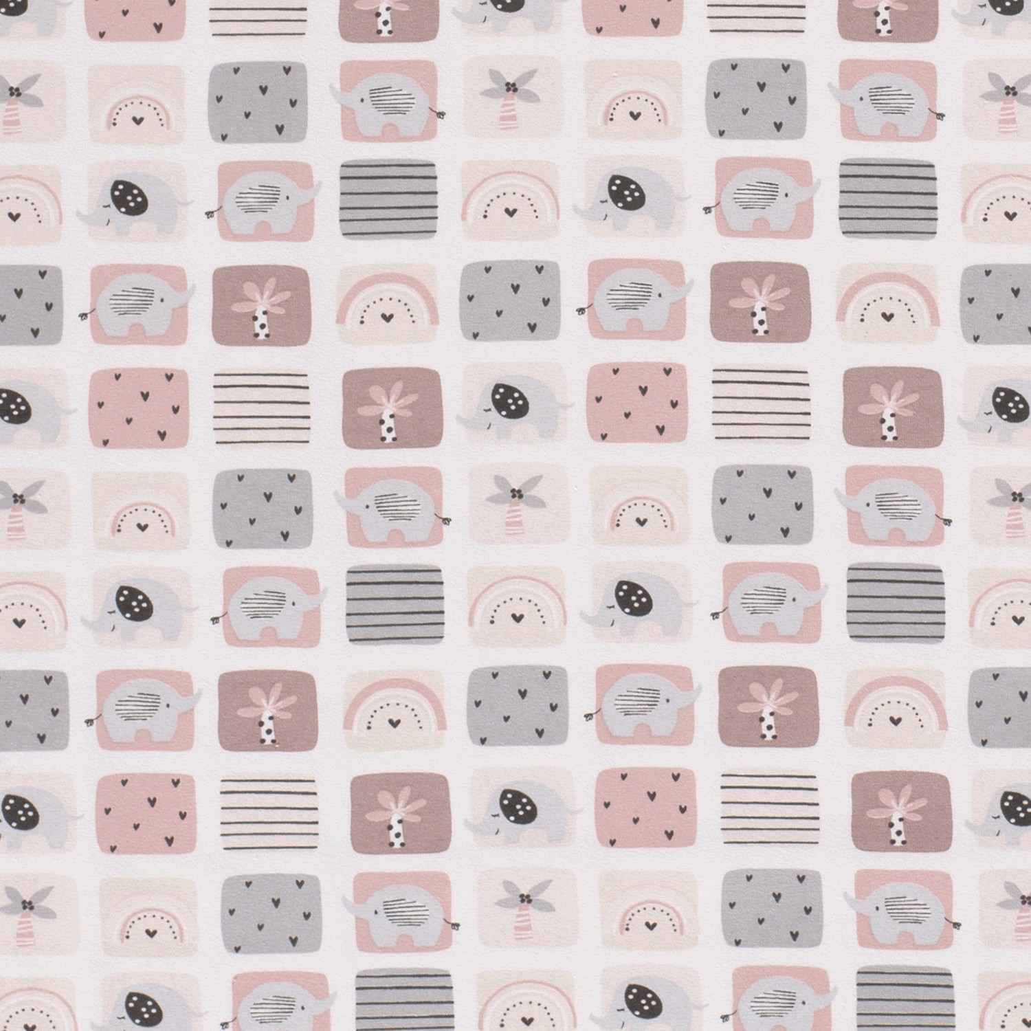 Ett tyg att förälska sig i: På en mjuk, ljus gammalrosa bakgrund leker små elefanter i kärleksfullt designade patchworkrutor. Mjuka mönster som prickar, stjärnor, romber och små ornament avlöser varandra och ger designen en lekfull, handgjord karaktär – nästan som en sydd patchworkfilt.