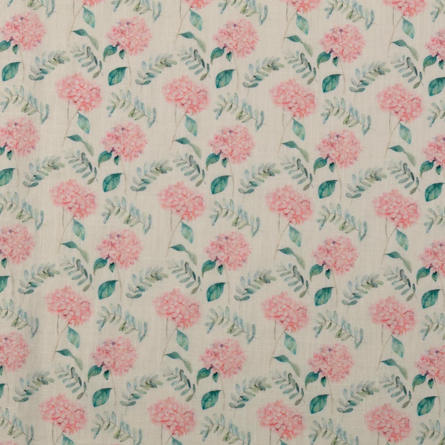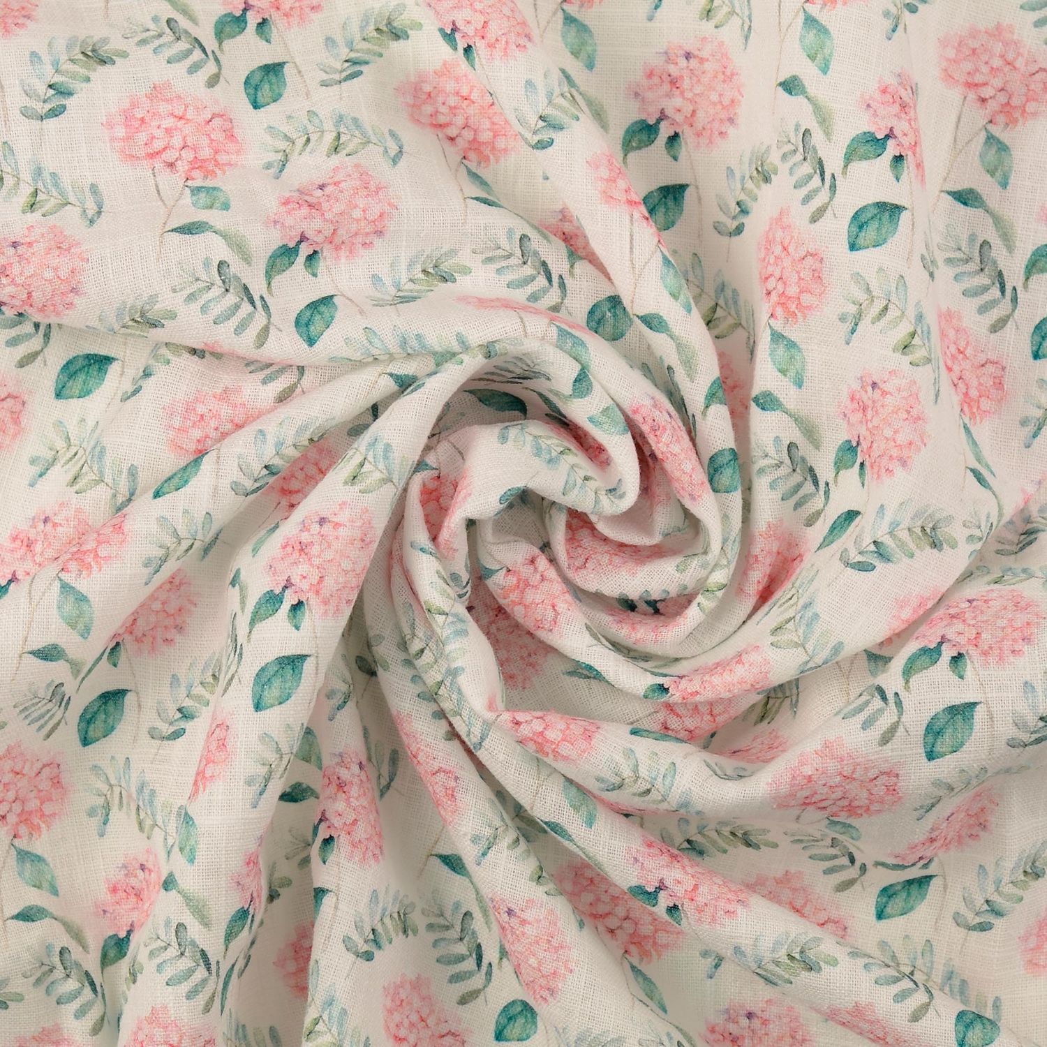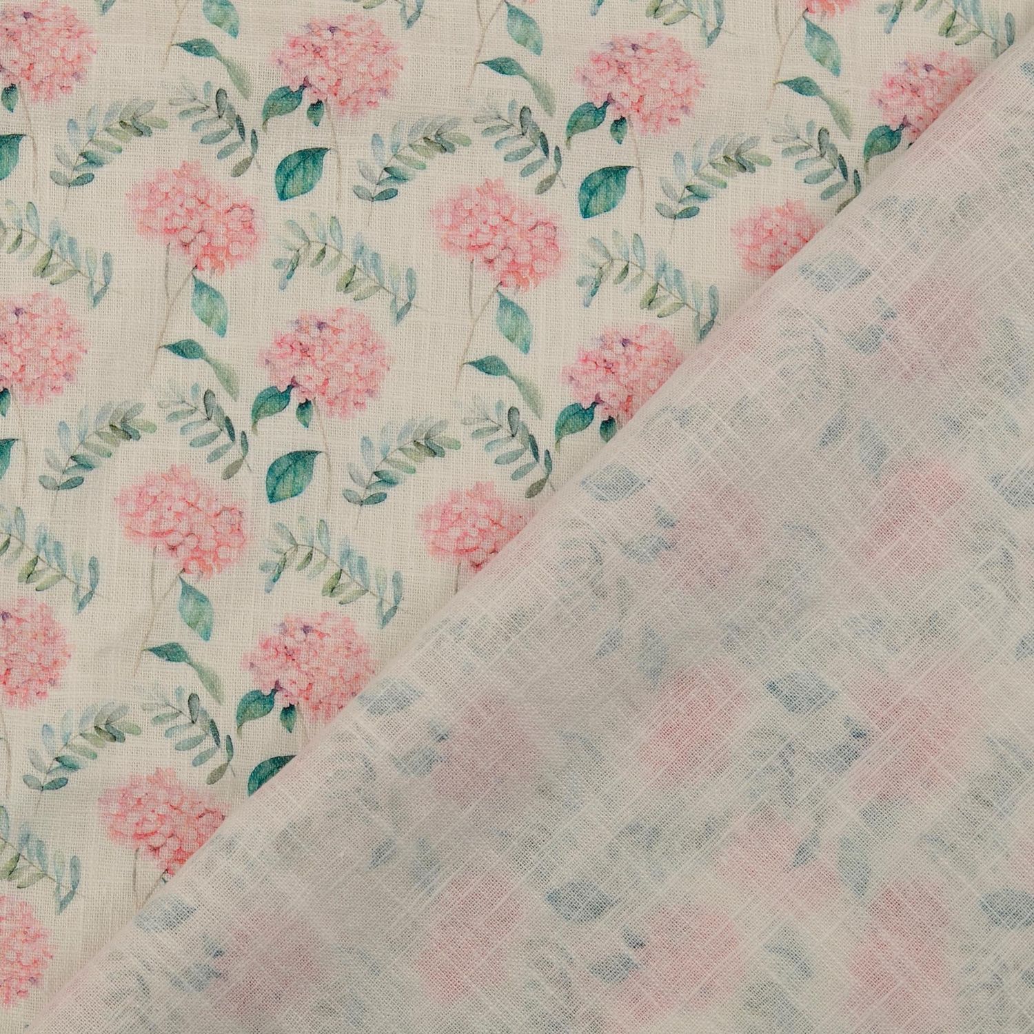 Mjuk som en vårmorgon: På det mjukt tvättade linnet blommar fina blommor i vitt och rosa, mjukt accentuerade av fina gröna toner i lövverket. Blommorna ser ut som omsorgsfullt akvarellerade – ibland tätt arrangerade, ibland löst spridda – och ger tyget en romantisk, naturlig lätthet.