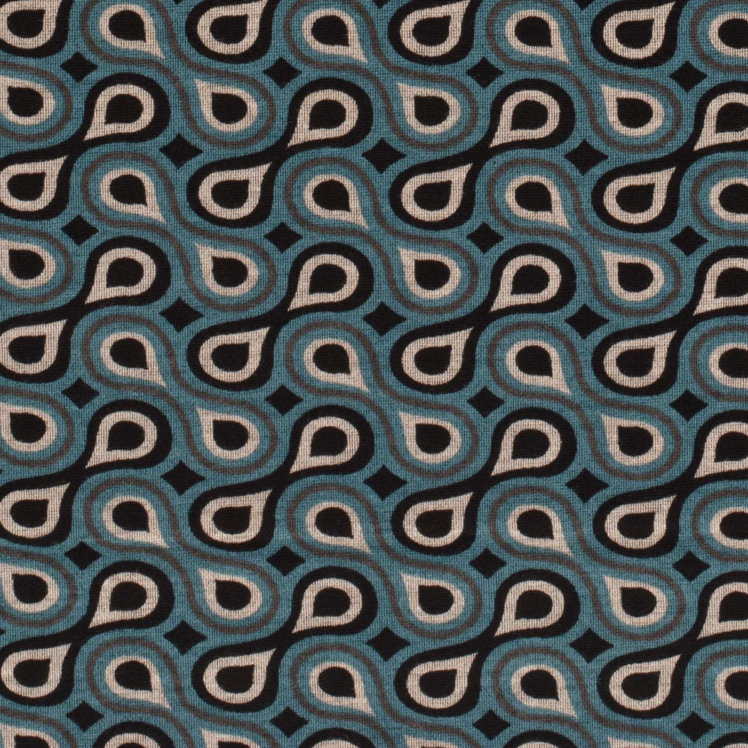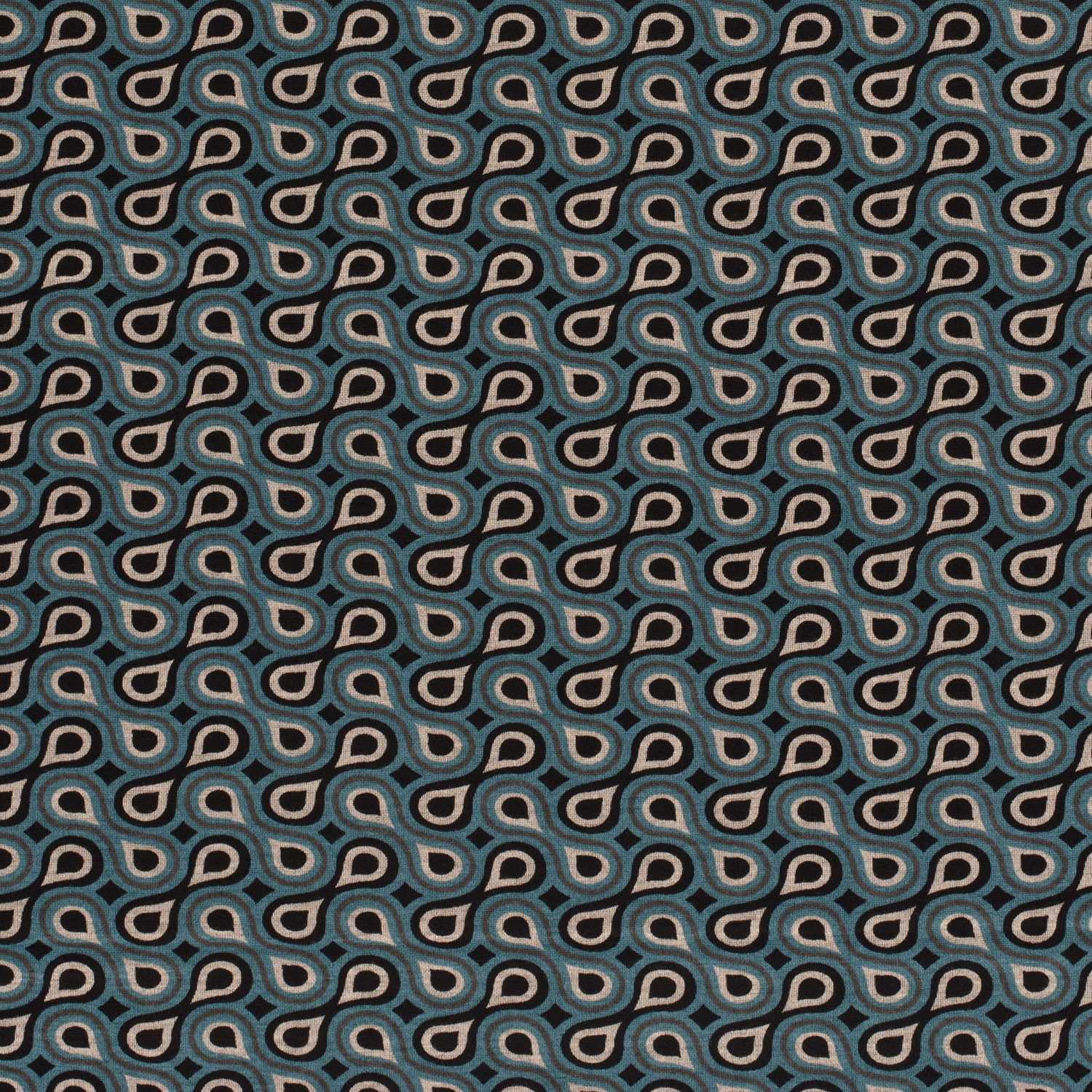 En modern blickfångare med tidlös elegans: På en djupsvart bakgrund dansar otaliga små droppar i lysande petrol över ytan. Det fint tecknade mönstret liknar en stiliserad regnskur – levande, men ändå harmoniskt och lugnt.