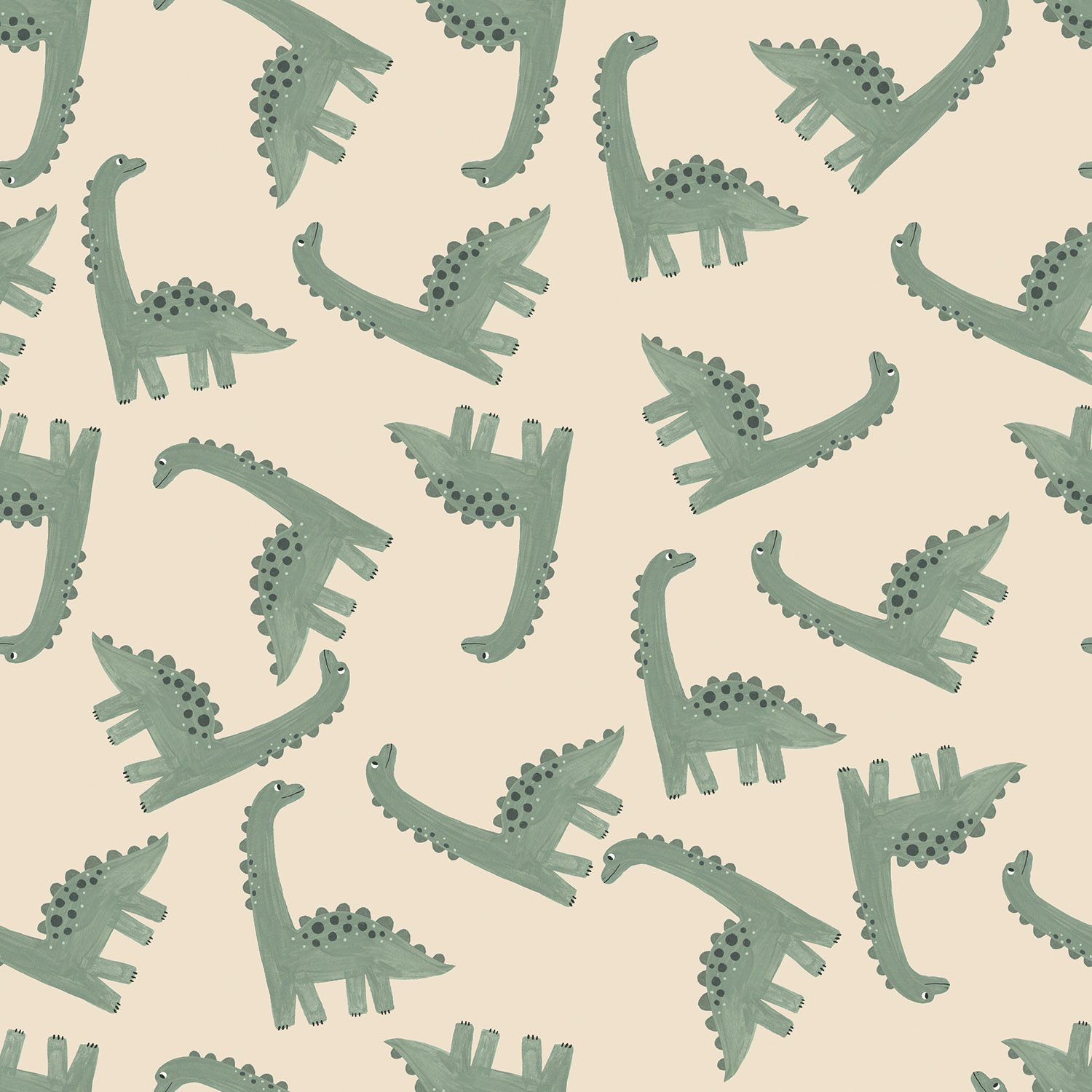 Det här regnjackstyget gör alla utomhusäventyr dubbelt så roliga! Glada dinosaurier i mjuka nyanser av grönt och blått tumlar runt på en sandfärgad bakgrund, kärleksfullt tecknade och med massor av små detaljer som får barnens ögon att lysa.