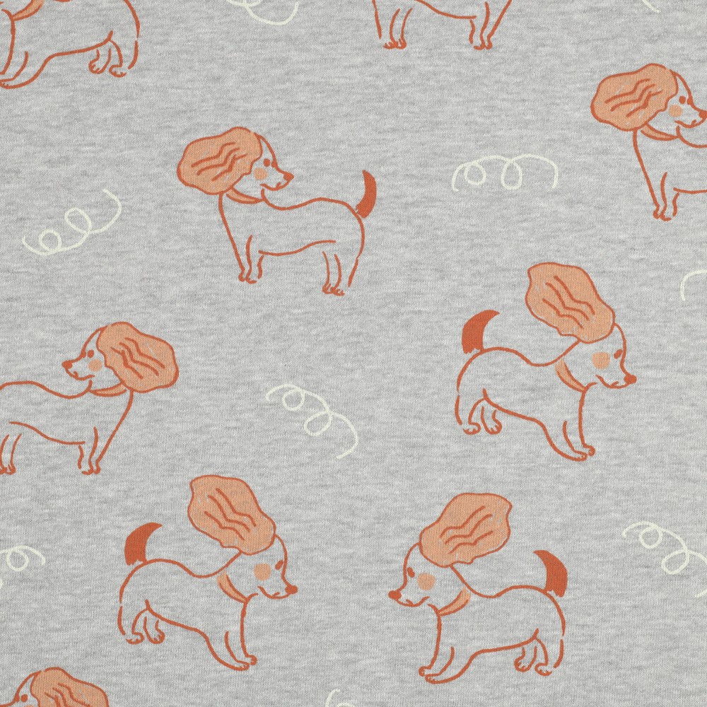Ett tyg att bli förälskad i – på den mjukt melerade ljusgrå leker glada hundar i olika poser och storlekar. De kärleksfullt ritade fyrbenta med mörka konturer och fina detaljer ser ut som om de snart ska hoppa loss för att leka.
