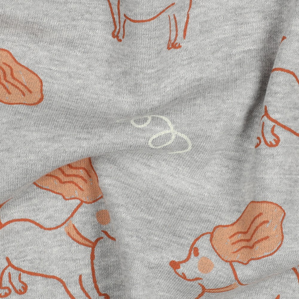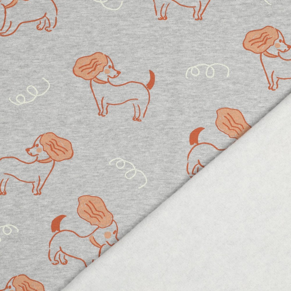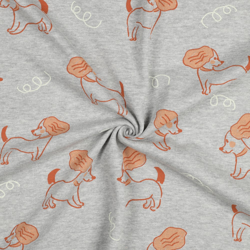 Den borstade sweatshirten har en underbart mjuk insida och inbjuder direkt till mys – perfekt för bekväma hoodies, avslappnade sweatshirts, joggingbyxor eller sköna kläder för barn och vuxna. Den diskreta melangeoptiken passar utmärkt att kombinera, medan det söta hundmotiv ger ett glatt blickfång.