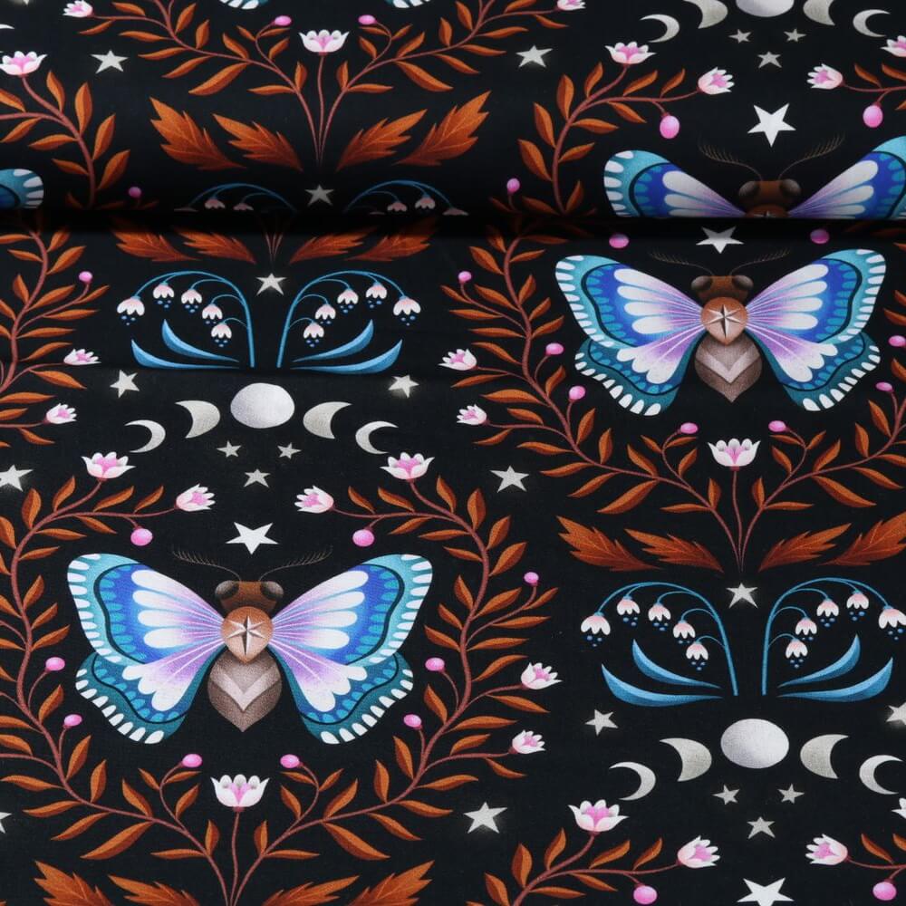 En mystisk natthimmel för dina sömnadsprojekt: Intrikata nattfjärilar i varma rost- och koppartoner vecklar ut sig på en djupsvart bakgrund, fint accentuerad av ljusa grädd- och beigenyanser. Fint tecknade vingstrukturer, små prickar och vackra detaljer ger designen en nästan magisk, nattlig atmosfär - som en promenad genom en förtrollad trädgård i månskenet.