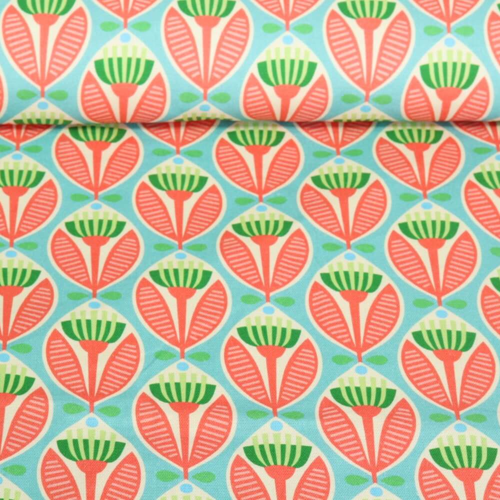 Denna glada organiska canvas från Hamburger Liebe ger en riktig sommarkänsla på ditt sybord. Designen består av små, stiliserade blomknoppar och blad som sprider sig över tyget som en färgglad blomstermatta. Den fräscha turkosa basen varvas med ljusa accenter i rosa, gult, orange och grönt - en livlig färglek som omedelbart fångar ögat.