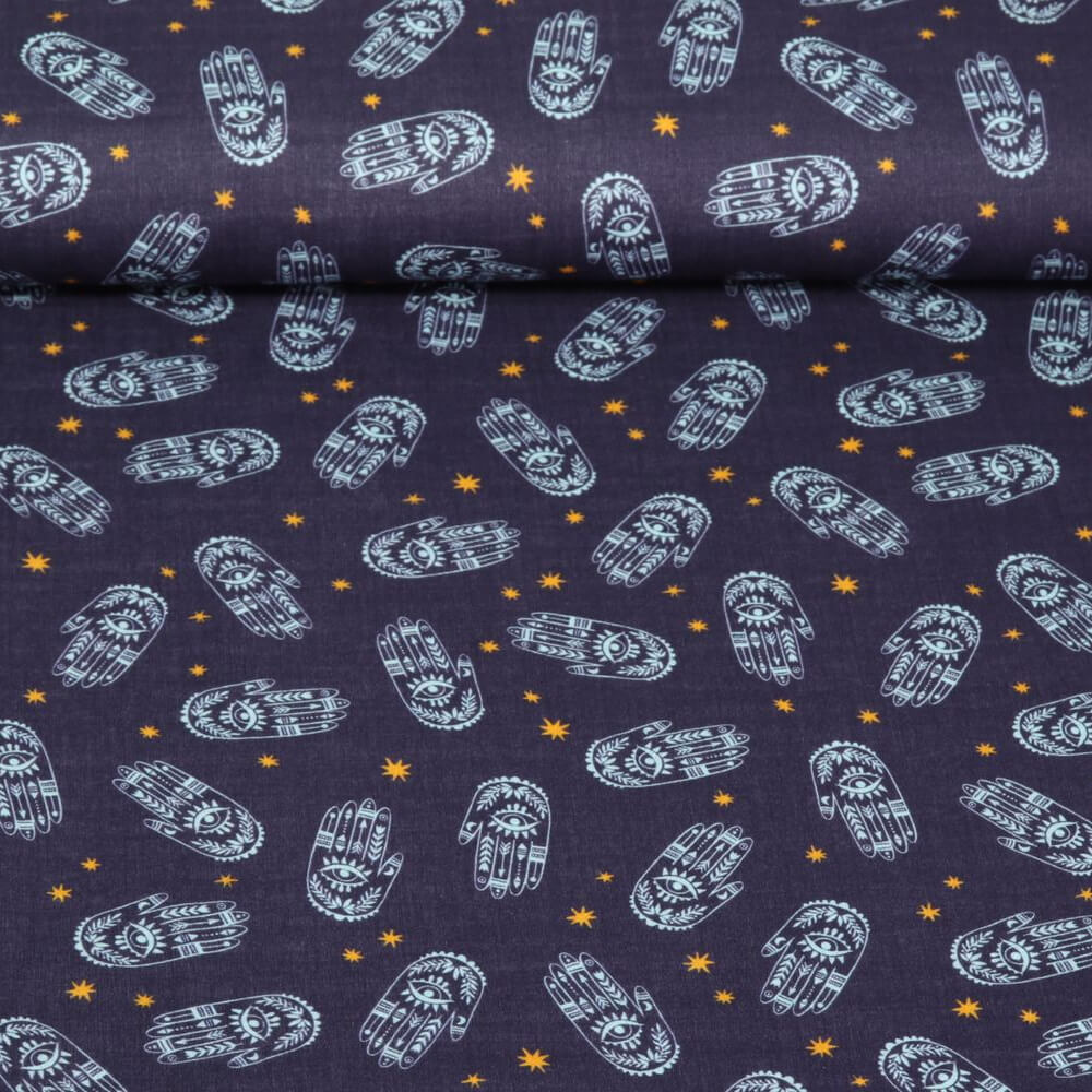 Denna navy muslin kombinerar en sofistikerad, mörk färgpalett med en subtil antydan till mystik - ett tyg som berättar historier och ger varje sömnadsprojekt en speciell, skyddande aura.
