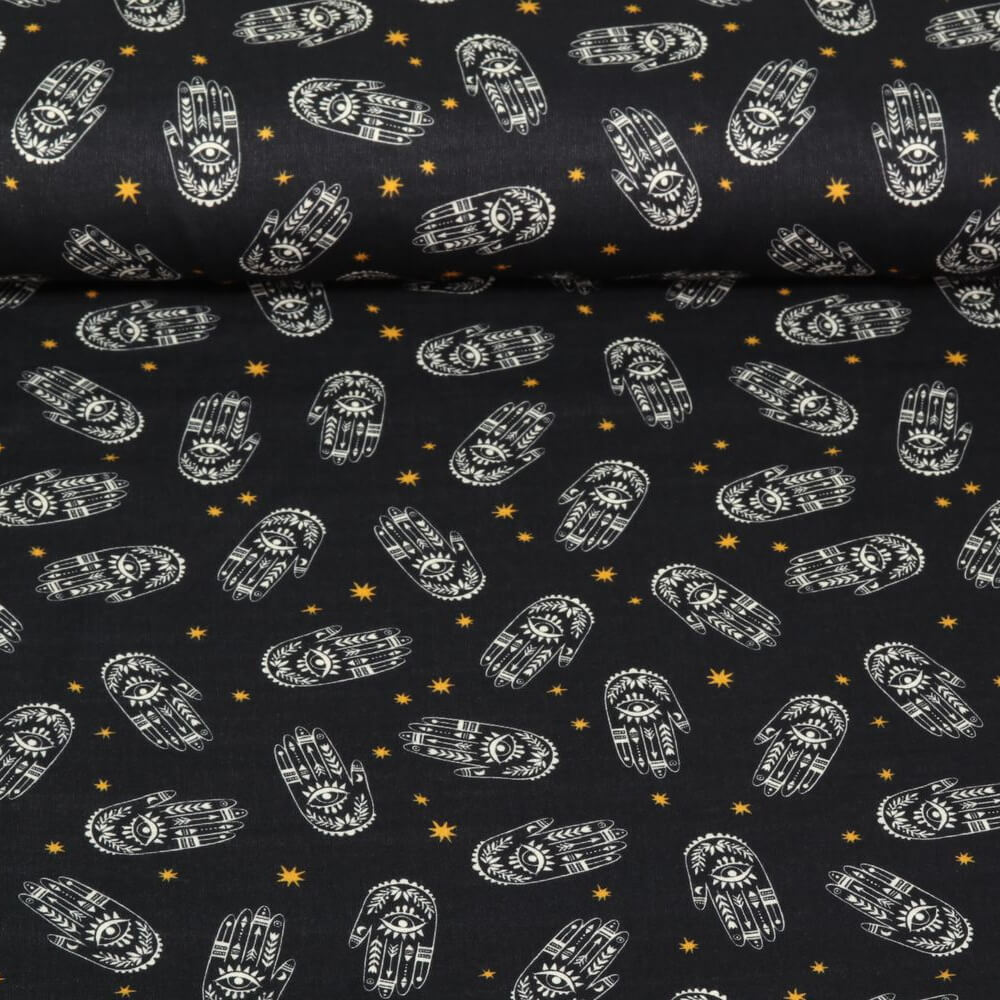 En gnutta magi för dina sömnadsprojekt: Fina, grafiska skyddssymboler skimrar som små lyckoamuletter på en djupsvart bakgrund - ibland fint prickade, ibland stiliserade som ögon eller stjärnor, ibland som gnistrande ornamentlinjer. De subtila, ljusa accenterna i kräm- och beigetoner skapar en mjuk glittereffekt utan att vara påträngande.