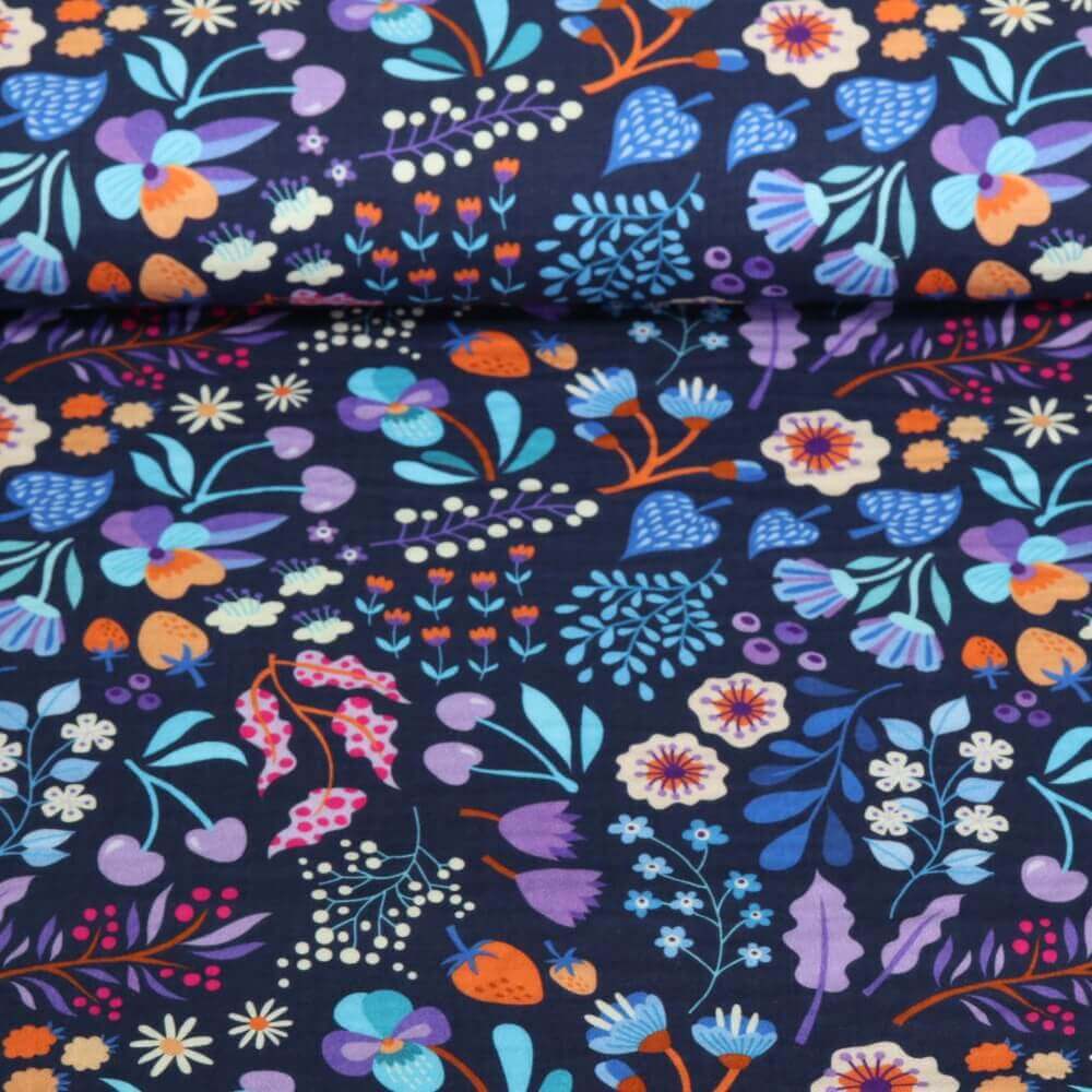 Den harmoniska färgpaletten med mörkblått, mjuka gröna toner, varm beige och terrakotta-accenter är både livlig och lugnande. Det släta muslinet har ett mjukt fall, känns behagligt mot huden och är perfekt för luftiga sommarkläder, söta barnkläder, mysiga sjalar, filtar eller accessoarer.