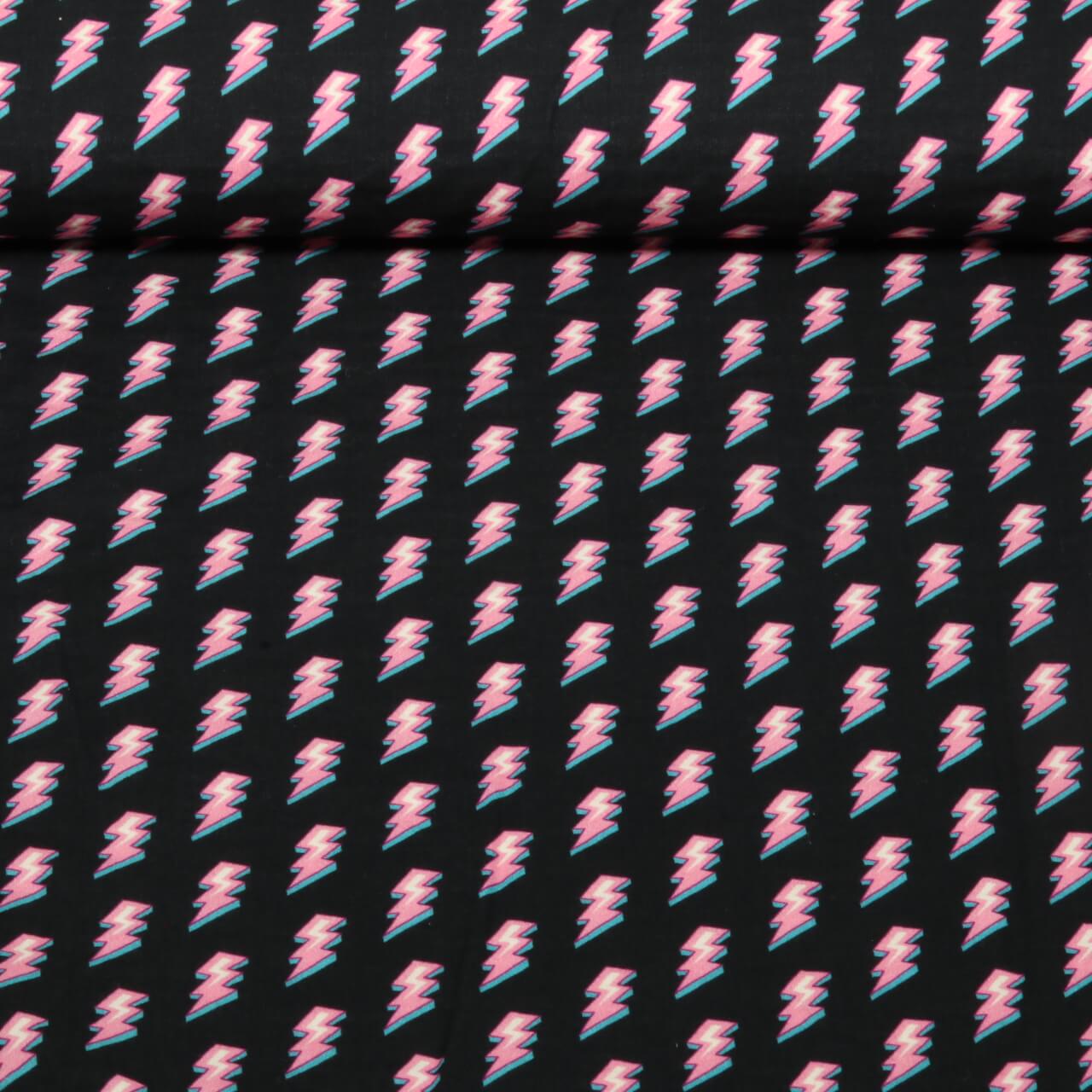 Den här musslan är en riktig statement piece: kraftfulla, färgglada blixtar i rosa, orange, gult, turkost och ljusblått lyser mot en djupsvart bakgrund - som små energiutbrott som dansar över tyget. Designen "Choose your Vibe - Power" utstrålar dynamik, mod och gott humör och gör varje sömnadsprojekt till ett blickfång.