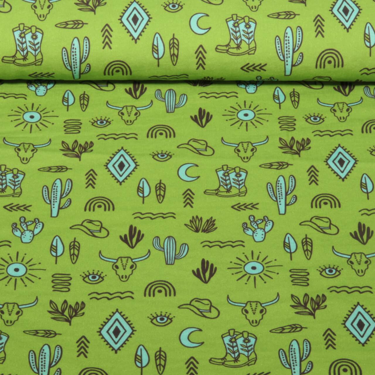 En gång vilda västern, en gång sagoland - den här förtrollande muslinen kombinerar båda i en unik design. En lekfull västernscen utspelar sig i frodig, varm grönska: små cowgirls och cowboys, hästar, kaktusar, hästskor och vackra detaljer berättar sin alldeles egna "Yeehaw"-historia. De fina illustrationerna ser ut som hämtade ur en bilderbok och gör materialet oemotståndligt för både barn och lekfulla vuxna.