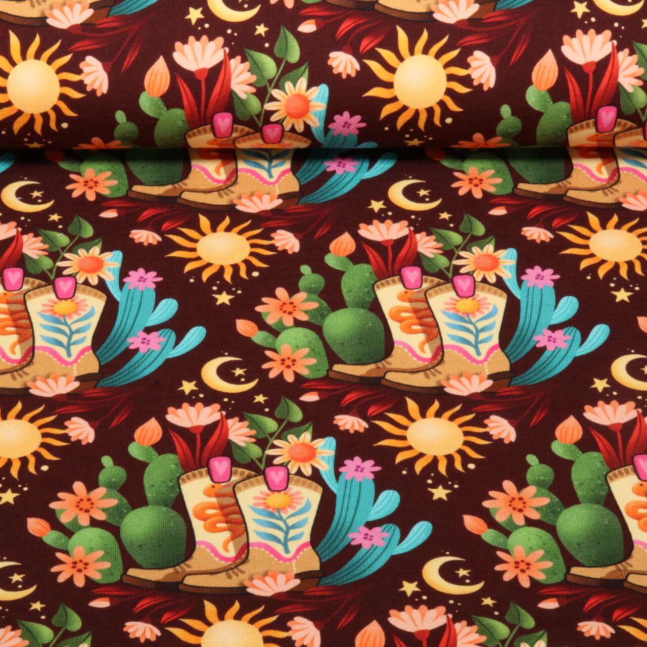 Denna förtrollande sommarsweat från kollektionen "Western Fairy Tales" kommer att ge ditt syrum en riktig cowgirlkänsla. Glada cowgirls i lekfulla poser tumlar runt på en klarröd bakgrund, omgiven av kärleksfulla detaljer som stjärnor, hästskor, kaktusar och små westernmotiv. Den harmoniska färgskalan med rött, rosa, gult, turkost och varma naturtoner ger designen en fräsch, glad och samtidigt lite nostalgisk känsla.