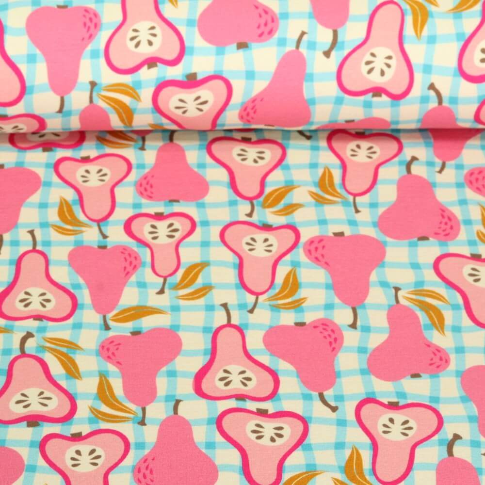 Ett tyg som en sommardag i parken: lekfulla päron i varma nyanser av gult och grönt tumlar runt på en mjukt rosa bakgrund, kärleksfullt illustrerad med fina detaljer. Däremellan små blad och subtila accenter som påminner om en glad picknickstund.