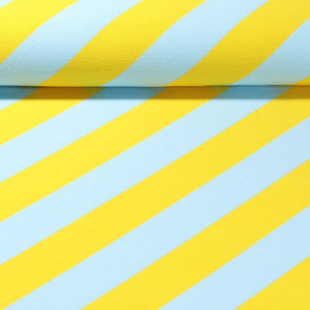 Denna organiska sweat i designen "Stripemania Solid" ger en frisk lätthet till dina sömnadsprojekt. Delikata nyanser av ljusblått och gult smälter samman för att skapa en modern, grafisk randig look som är både lugn och livlig.
