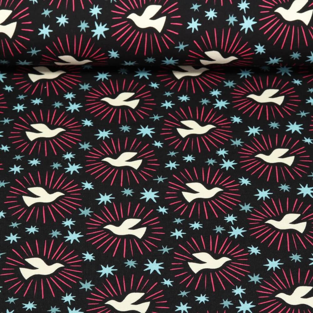 Ett tyg som en natthimmel full av magi: otaliga, fint skimrande prickar och små, gnistrande ljusreflexer lyser mot en djupsvart bakgrund - som glittrande damm som försiktigt har lagt sig över ytan. Digitaltrycket framhäver denna design på ett särskilt lysande sätt: fint, detaljrikt och med ett underbart färgdjup.