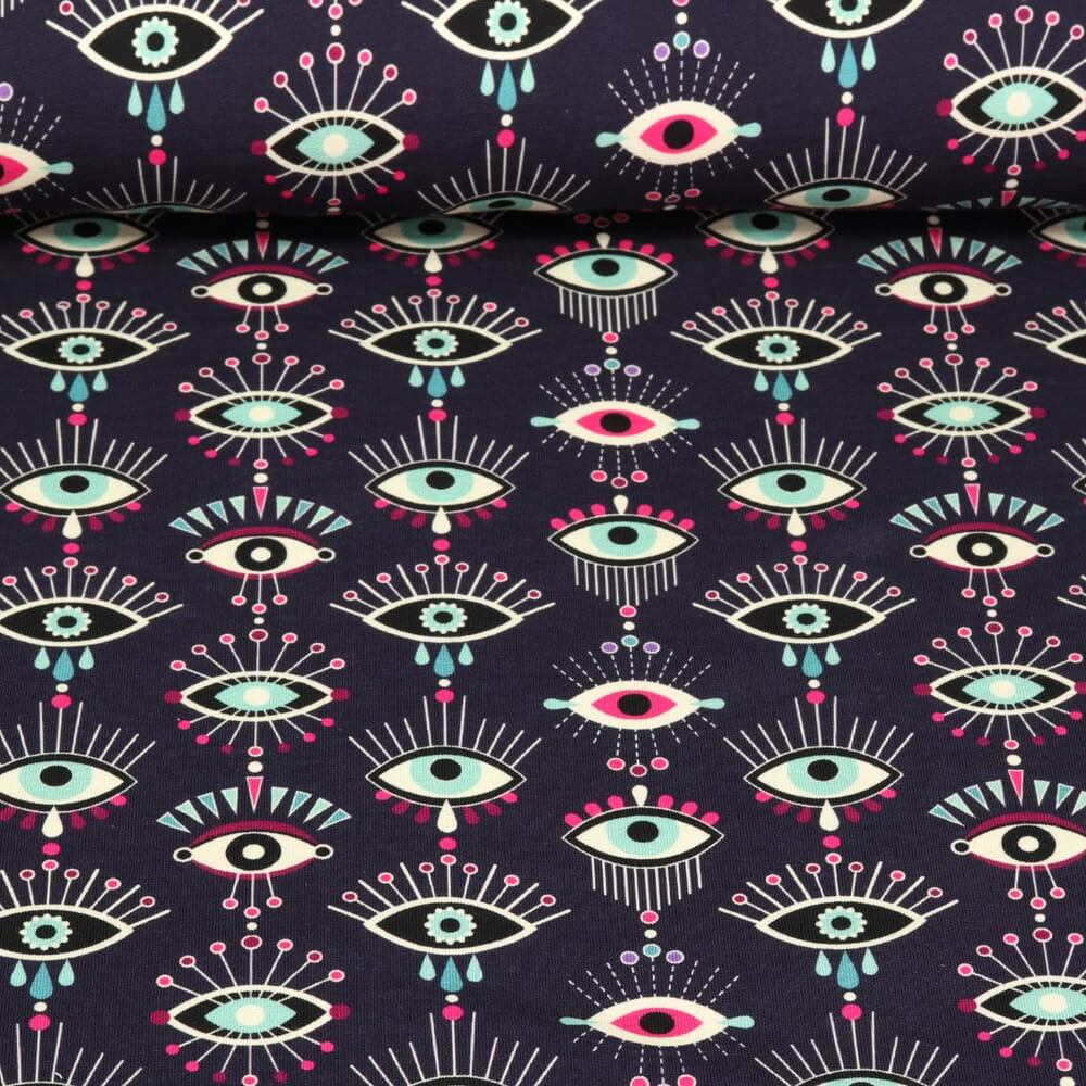 Ett tyg som ett litet uppror med glittereffekt förtrollar med en djup marinblå färg som scen för en uttrycksfull, feminin design. Fina, stiliserade kvinnofigurer, lysande stjärnor, små hjärtan och handritade bokstäver i nyanser av rosa, ros och bär löper över tyget som ett gnistrande statement.