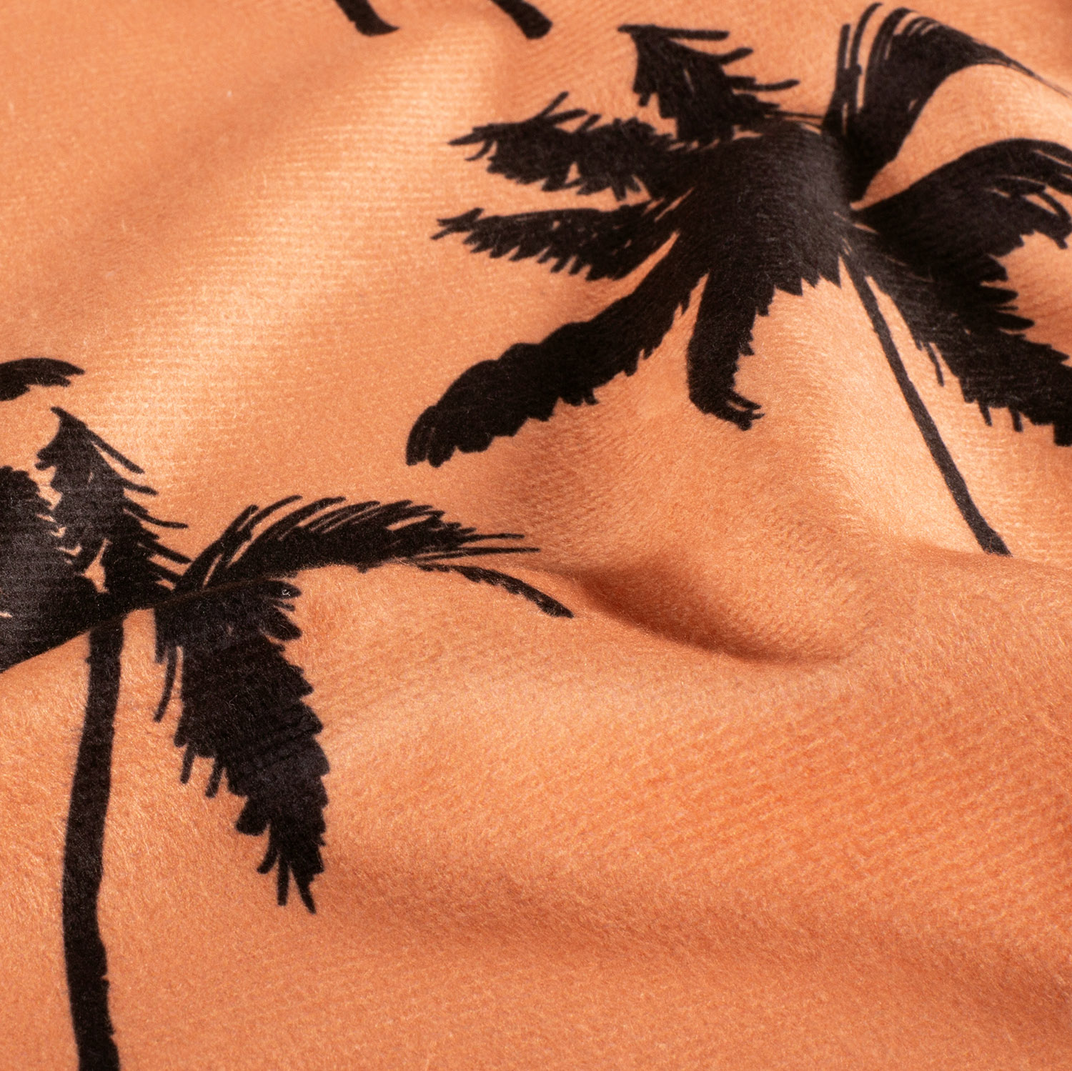 Denna strandhandduk ger omedelbart semesterkänsla i din vardag: Lysande orange och gula toner påminner om en varm solnedgång, medan eleganta palmsiluetter sträcker sig över hela ytan. Den detaljerade digitaltrycket får palmerna att nästan se levande ut och ger handduken en modern, tropisk känsla.