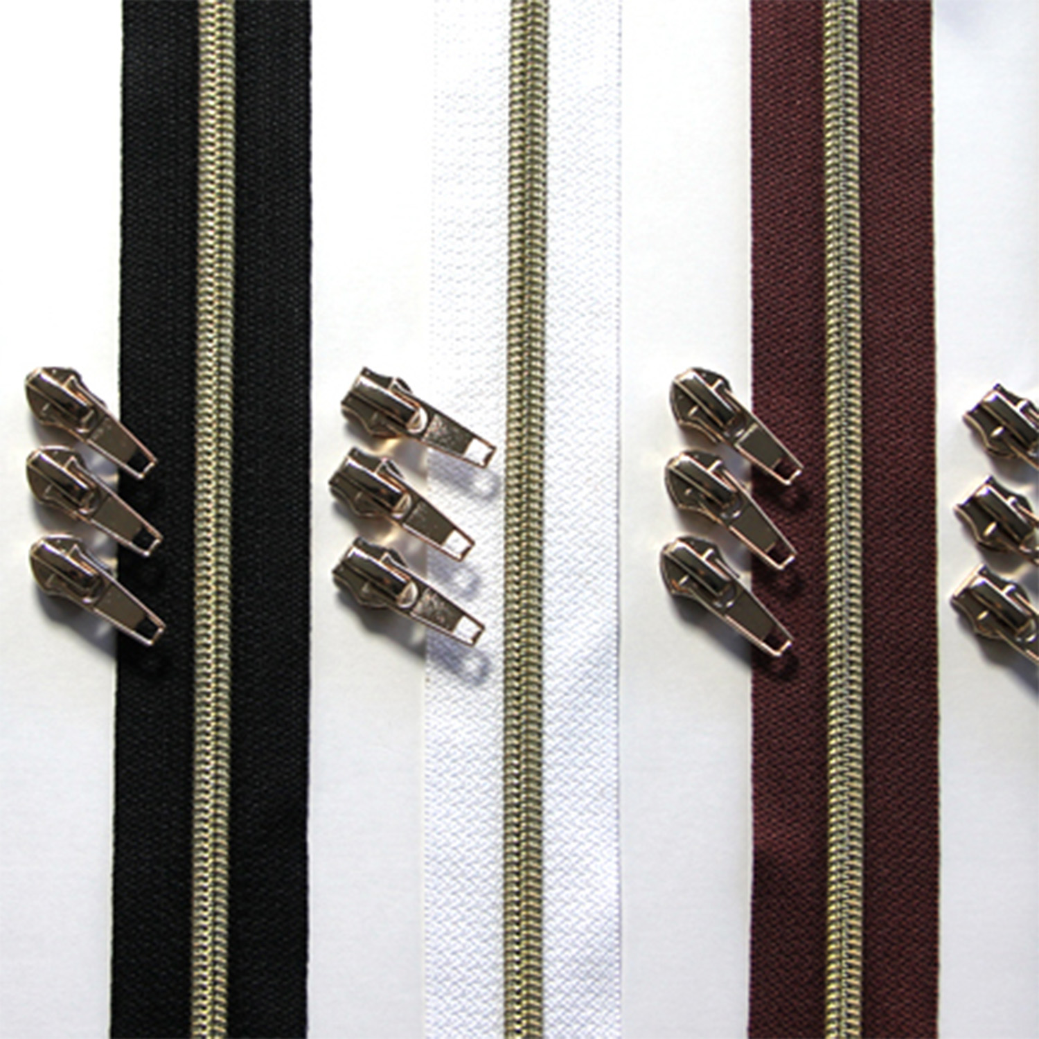 Du får 1 m blixtlåstejp med en 6,5 mm bred pärla och tre matchande autolock-sliders i ljusguld. Dragkedjorna är färdigskurna och färdigförpackade - observera att flera beställda delar inte levereras i ett stycke.