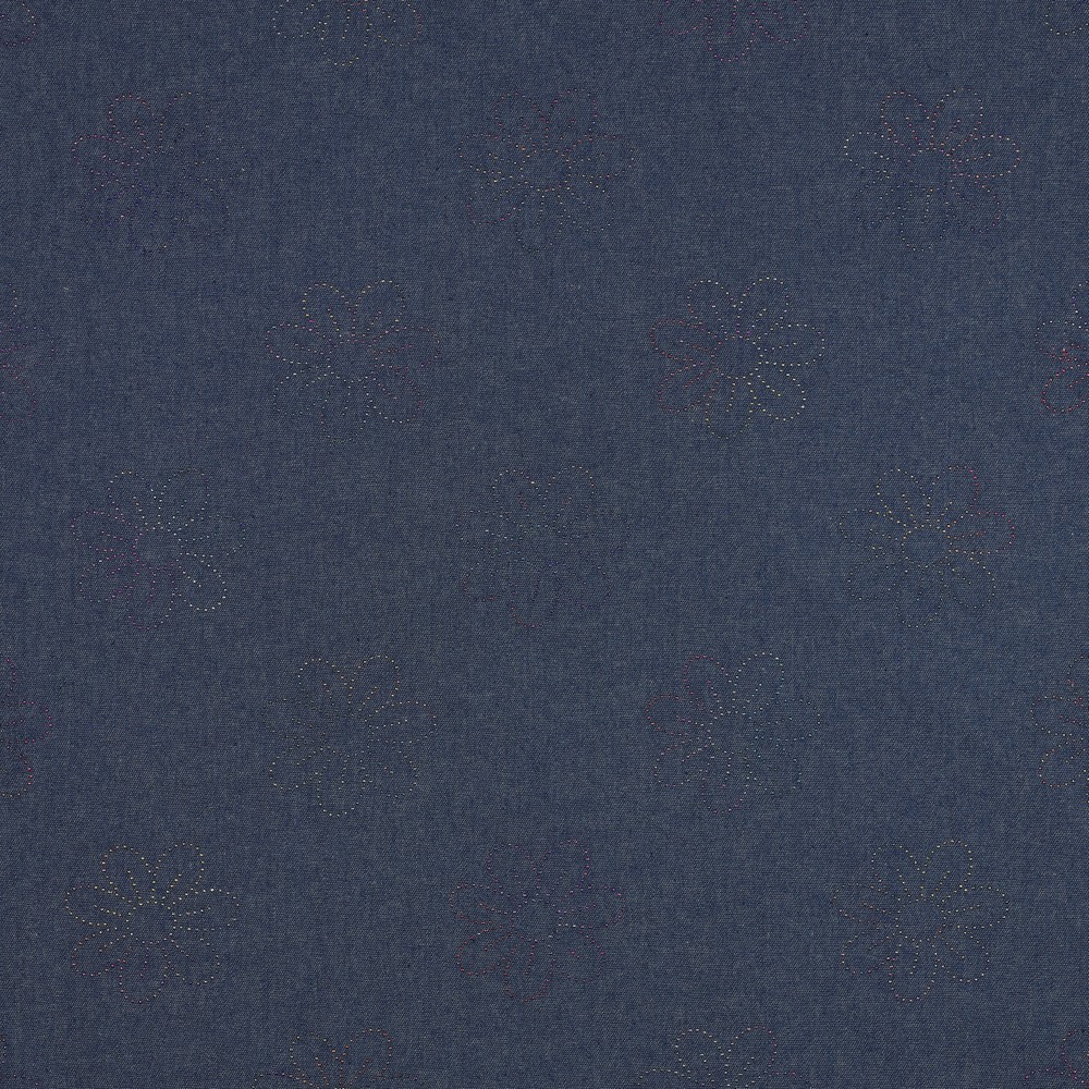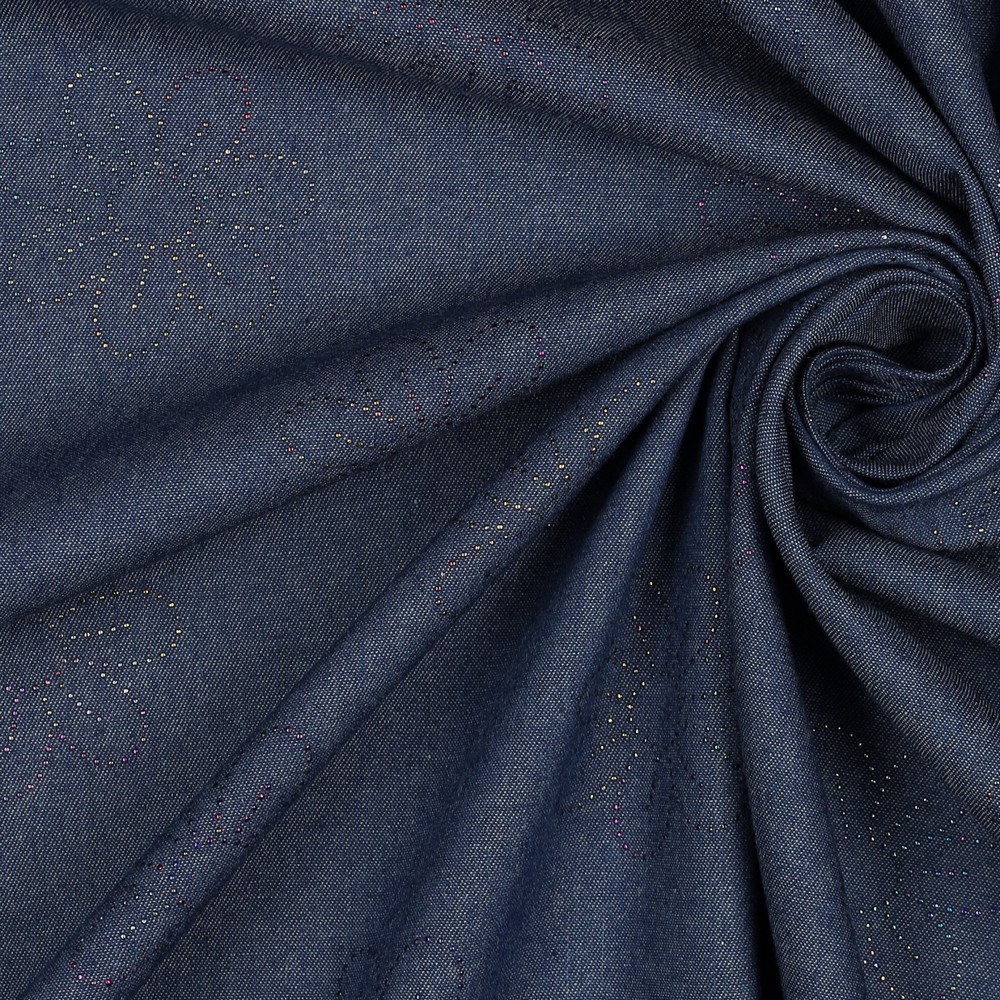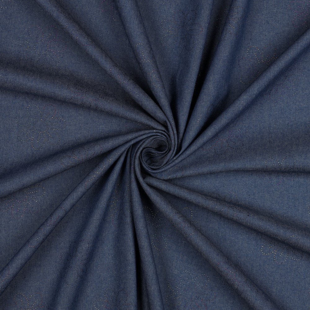 En jeansväv som omedelbart fångar blicken: På djupblå denim glittrar ädla blommotiv i glänsande folietryck. Ömtåliga blommor och fina blad slingrar sig över tyget och skapar ett elegant spel av ljus och skugga – beroende på rörelse förändras reflexerna och ger dina syprojekt en särskild, nästan lyxig utstrålning.